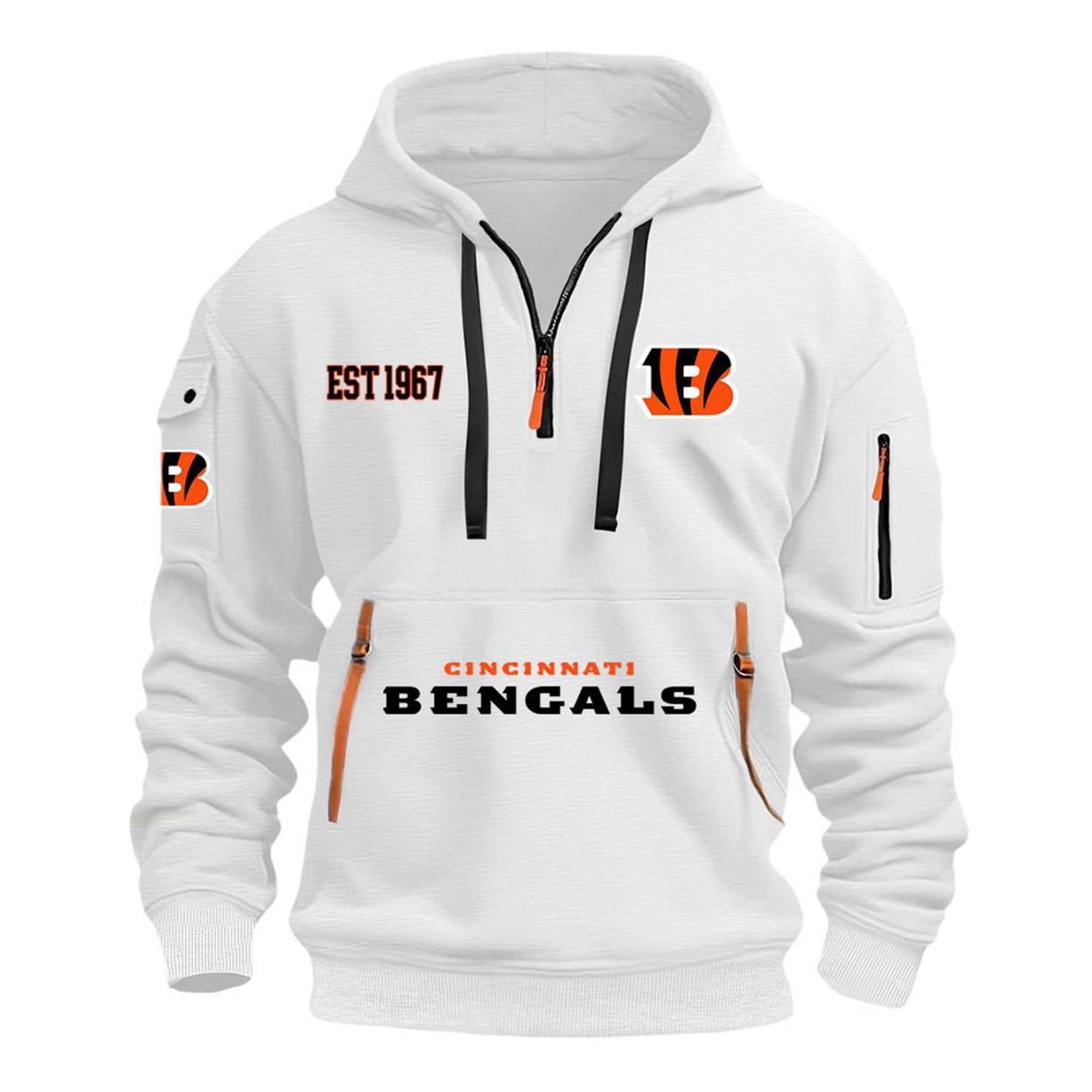 The front proudly displays “EST 1967,” celebrating the team’s rich history, alongside the fierce striped “B” logo. But the details are what set this hoodie apart. Featuring a modern quarter-zip neckline, a zippered utility pocket on the left sleeve, and a flap pocket on the right, it blends contemporary streetwear style with unwavering team pride. The spacious front kangaroo pocket, emblazoned with “CINCINNATI BENGALS,” is accented with stylish orange pull tabs, adding a unique, rugged touch to the overall design.