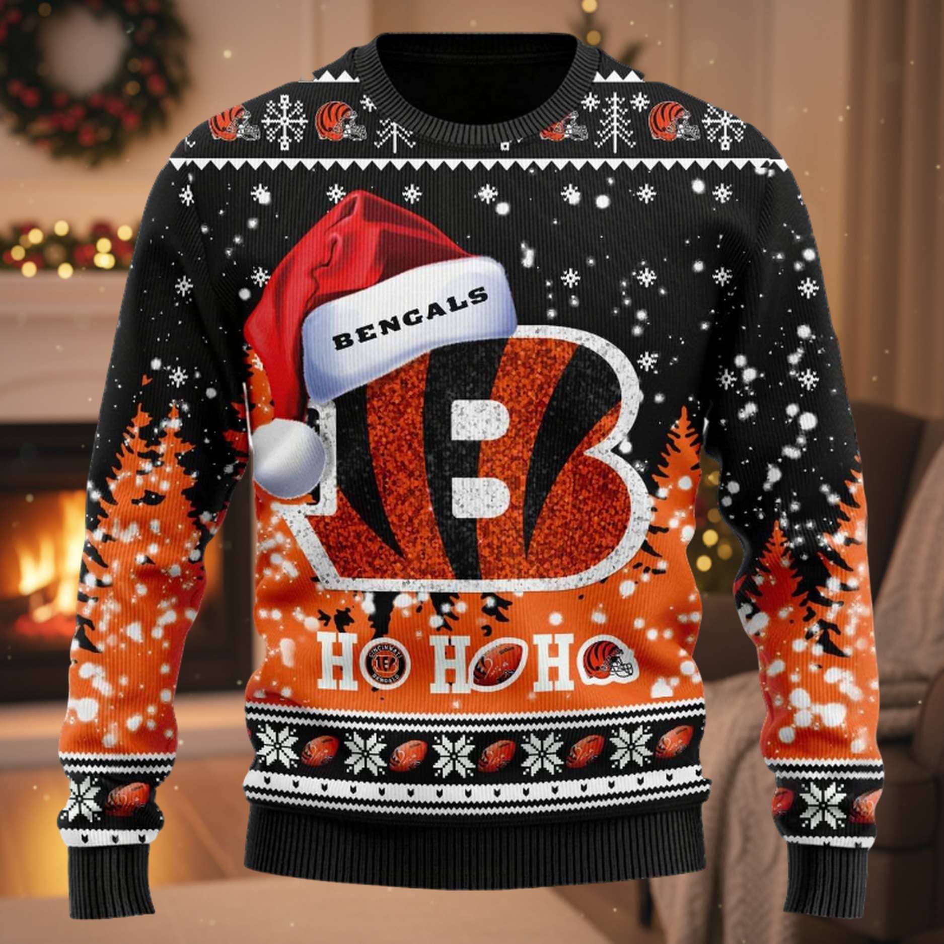 The Bengals Symbol Wearing Santa Claus Hat Ho Ho Ho Ugly Christmas Sweater