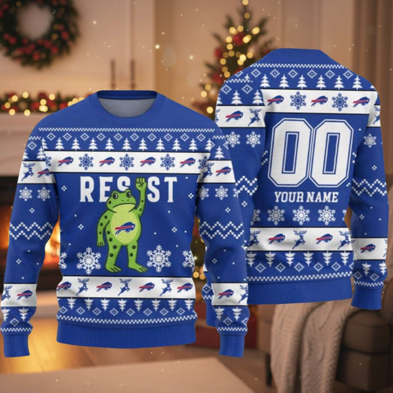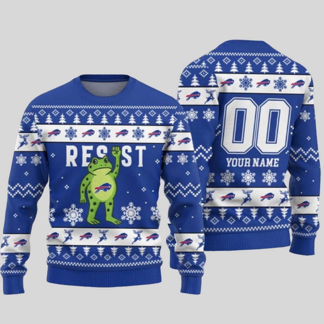 | Design Feature | Full-coverage “ugly sweater” print featuring a Bills-colored “RESIST” frog on the front, and a customizable back with Name and Number. |