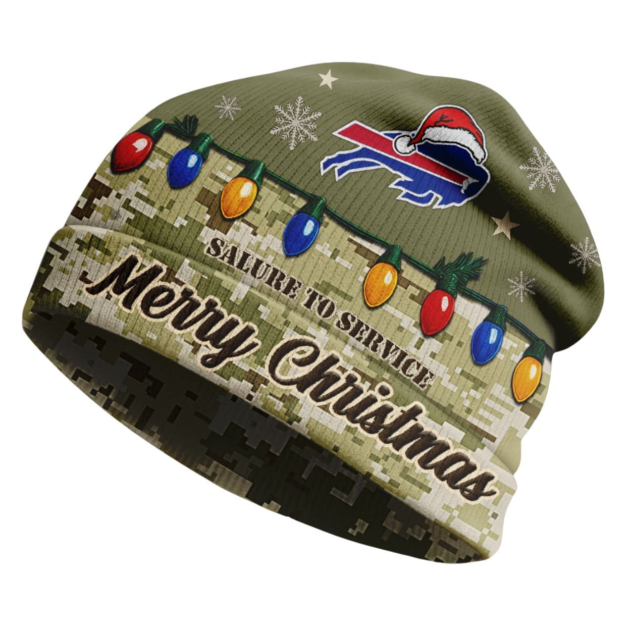 Team Pride: The Bills’ iconic charging Buffalo logo is printed near the crown, topped with a cheerful Santa hat to complete the festive look. The text “SALUTE TO SERVICE” is discreetly integrated into the design.
