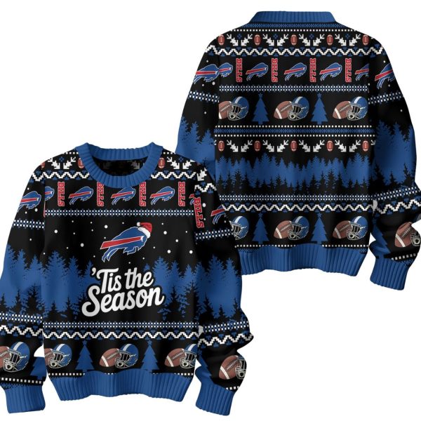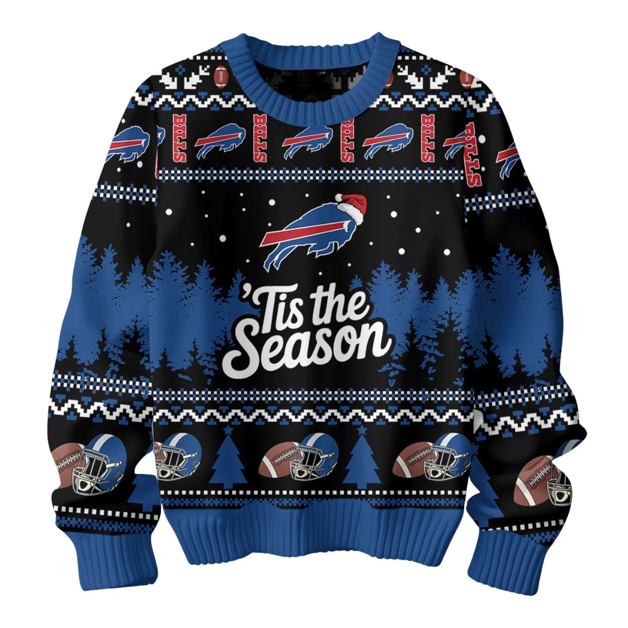 The design utilizes the iconic Bills colors—royal blue and red—against a black backdrop, creating a vibrant holiday pattern. The sweater features classic “ugly sweater” motifs like snowflakes, geometric bands, and dark pine trees. Front and center is the dynamic Bills charging buffalo logo wearing a festive Santa hat, situated above the bold holiday message ‘Tis the Season. The pattern is rounded out with repeating rows of the “BILLS” text logo, football helmets, and footballs across the chest, shoulders, and back.