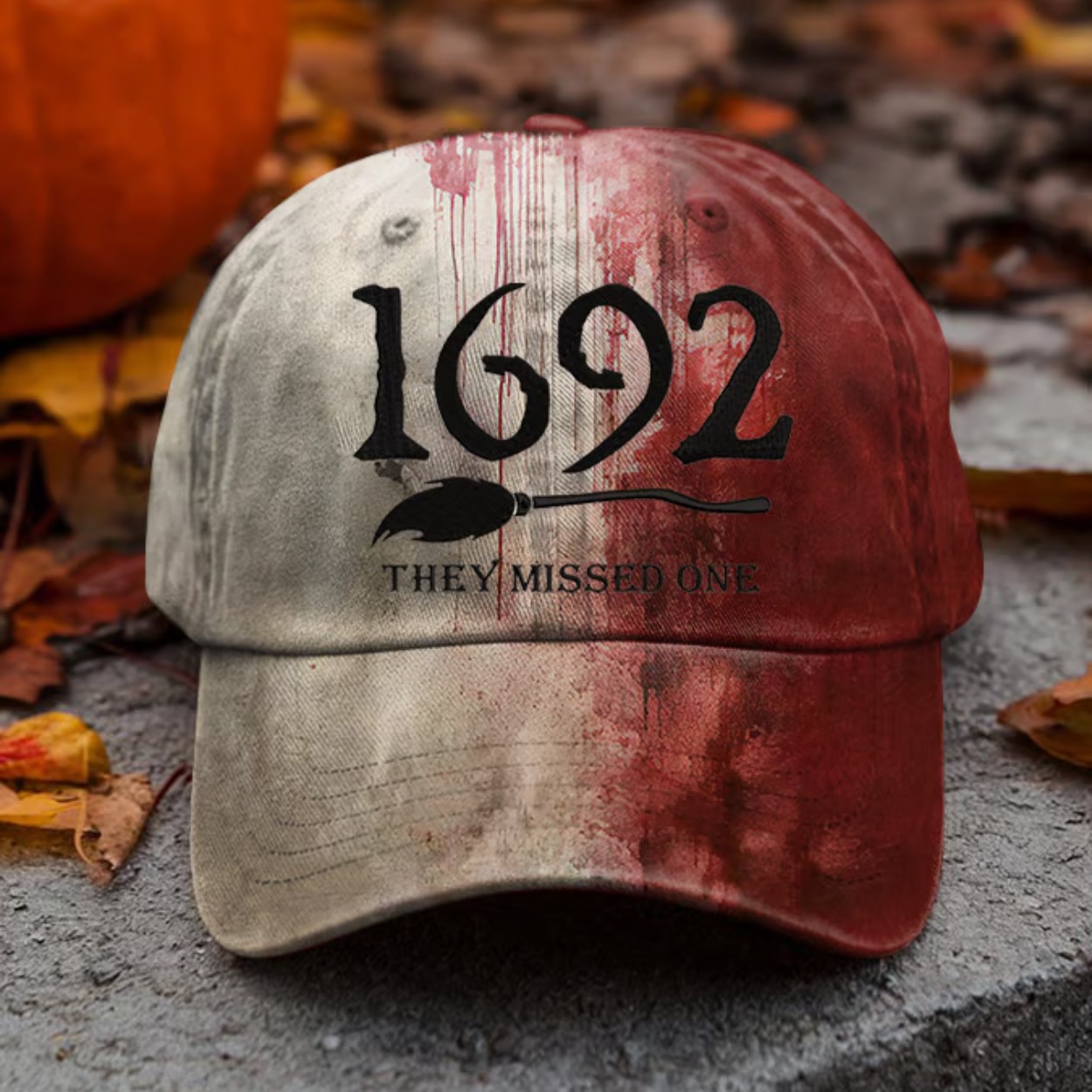 - This one-size-fits-all cap features a striking design with “1692” emblazoned across the front, paired with a broomstick and the bold phrase “They Missed One.”