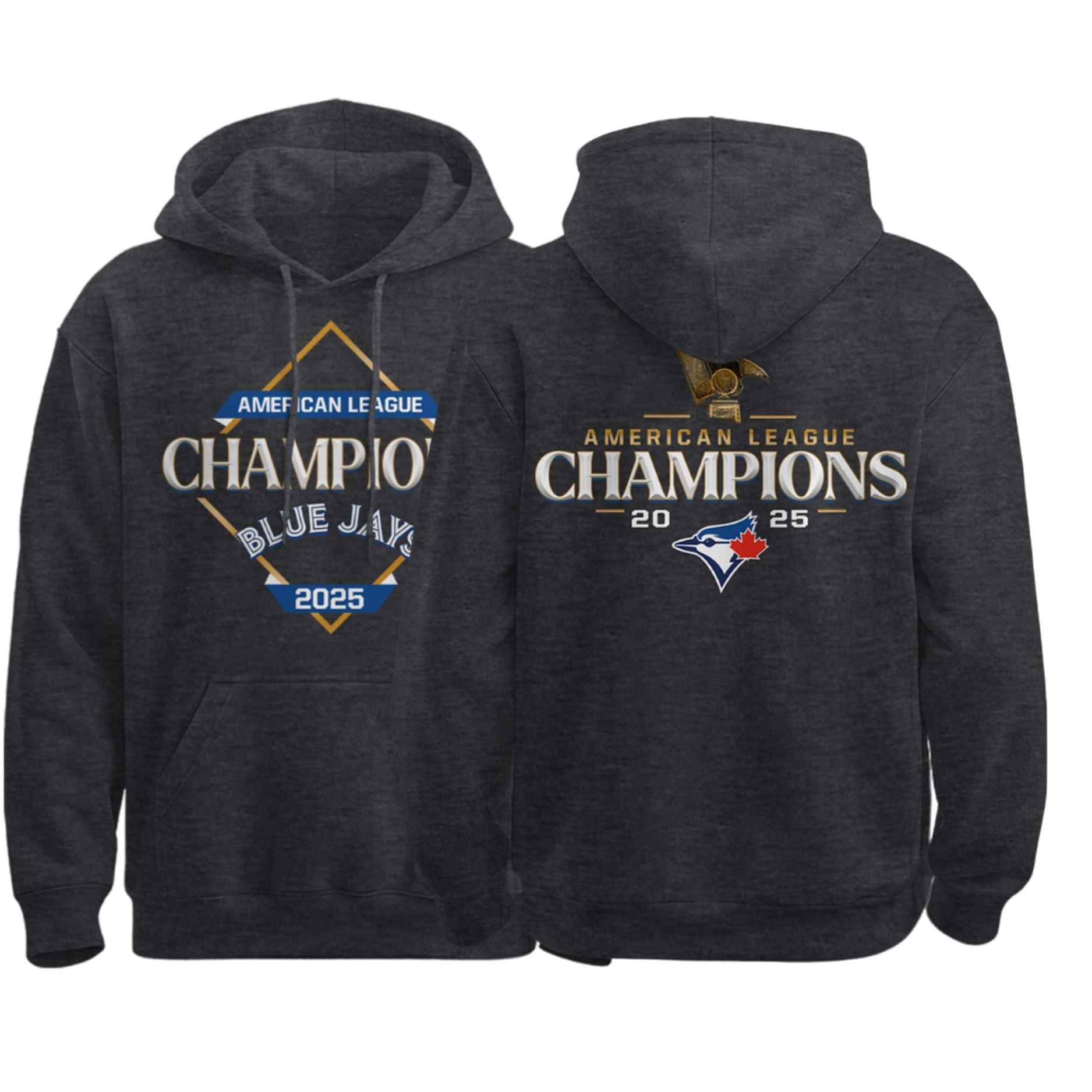 - The text “AL CHAMPIONS” is featured beneath a trophy silhouette, with the year “2025” flanking the Blue Jays logo.