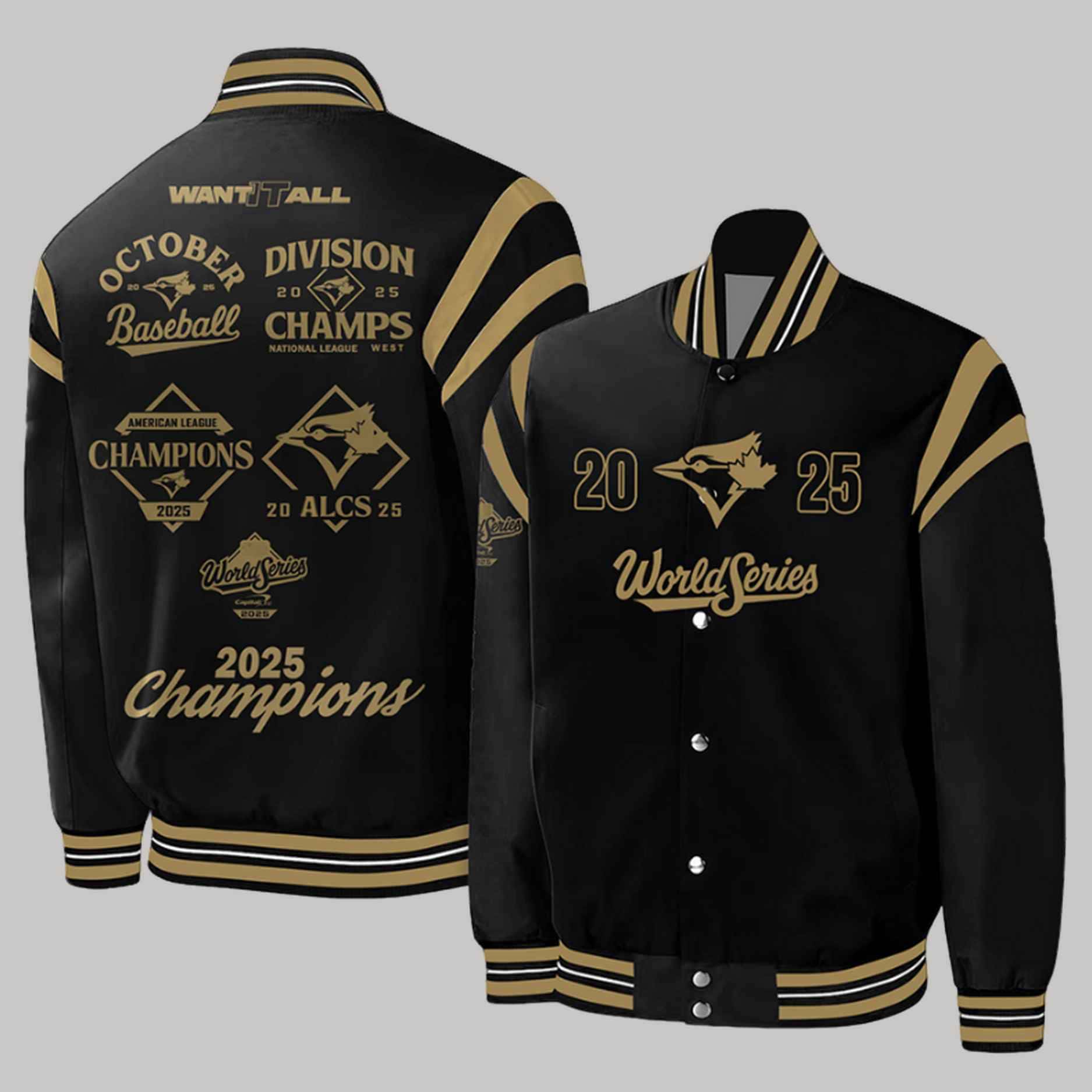 | Design Feature | Varsity style in Black/Gold, featuring the World Series logo/year on the front and a comprehensive 2025 Championship victory graphic on the back. |