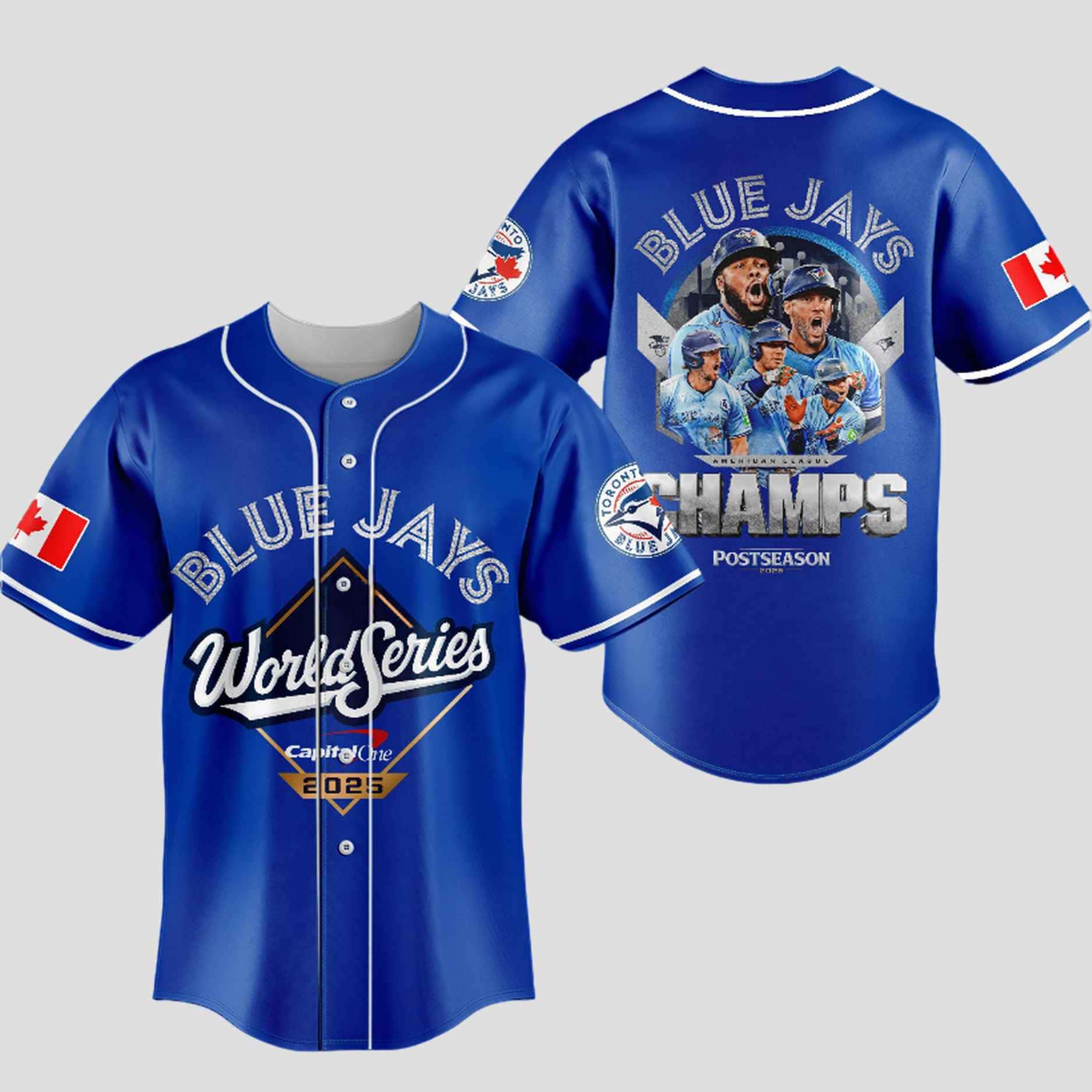 | Design Feature | Double-sided print: World Series 2025 crest (Front) and player celebration photo with “CHAMPS” graphic (Back); Canadian flag. |