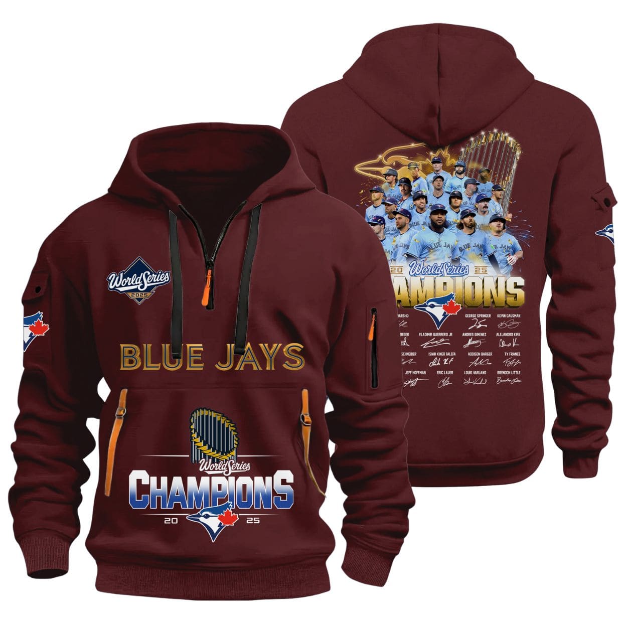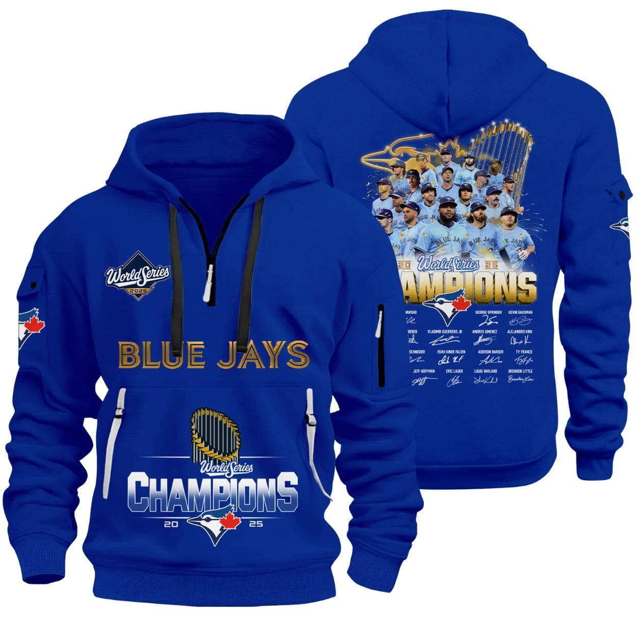 Celebrate the historic moment the Toronto secured World Series glory in 2025 with the exclusive Blue Jays 2025 World Series Signature Quarter Zip Hoodie!