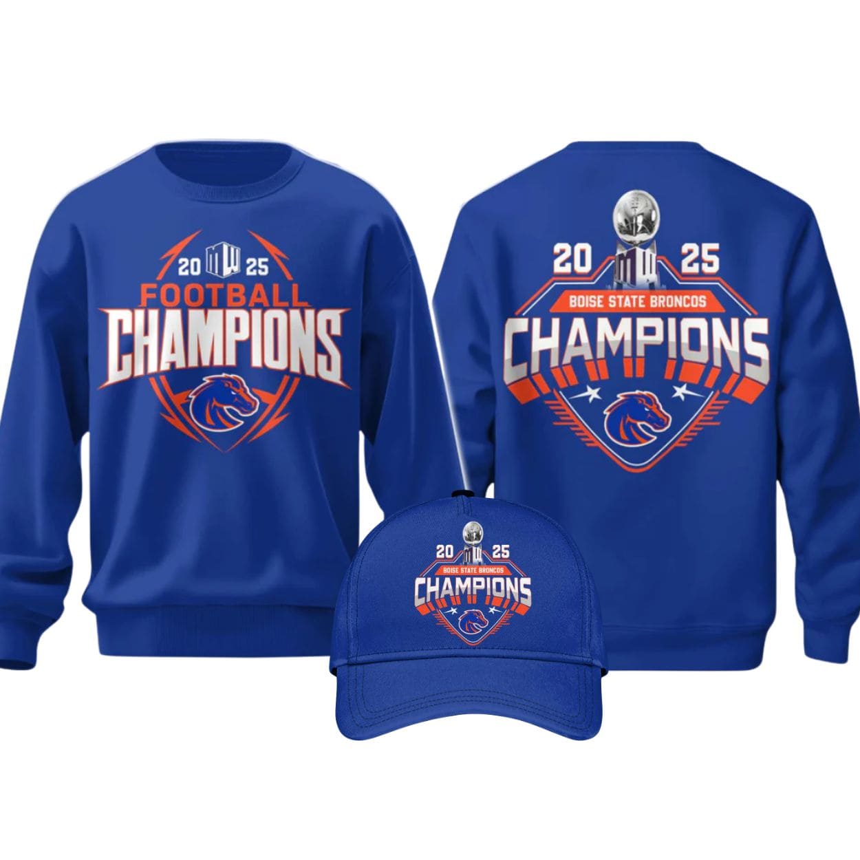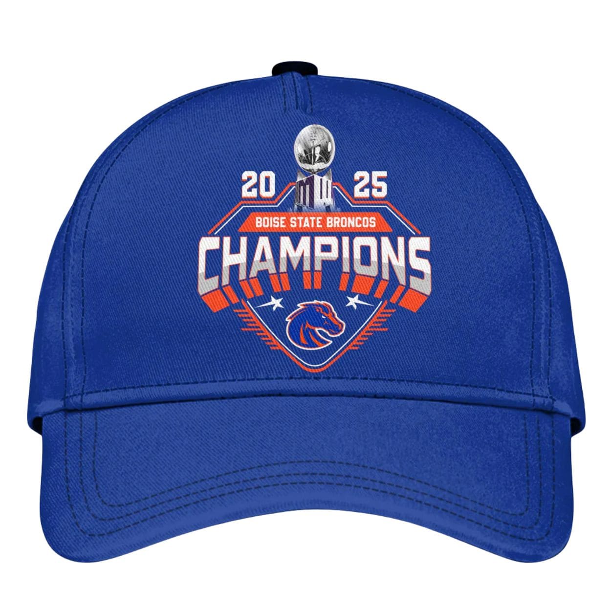 The back design reinforces the win with a large graphic, including a trophy, the text “BOISE STATE BRONCOS”, and the word “CHAMPIONS” surrounded by stars.