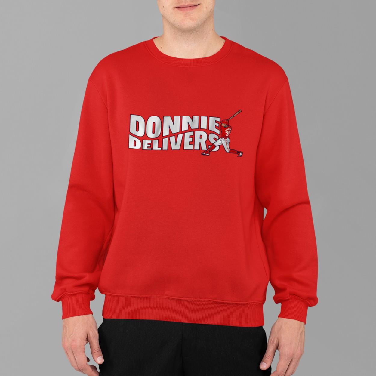 Celebrate Brendan Donovan’s clutch performance with the Brendan Donovan Donnie Delivers Shirt! This vibrant red tee honors the Cardinals star with a dynamic design featuring “DONNIE DELIVERS” in bold white lettering and an action shot of Donovan mid-swing, wearing his number 33 jersey. Perfect for game days or showing off your fandom, this shirt captures the excitement of his standout moments. Crafted from a comfortable cotton-polyester blend, it’s available in sizes S to 5XL, ensuring a great fit for all Cardinals fans in 2025.