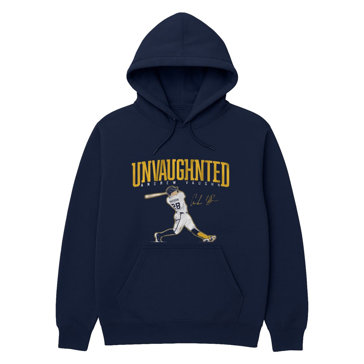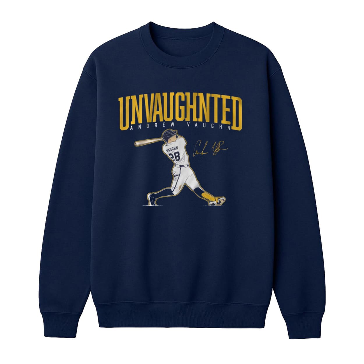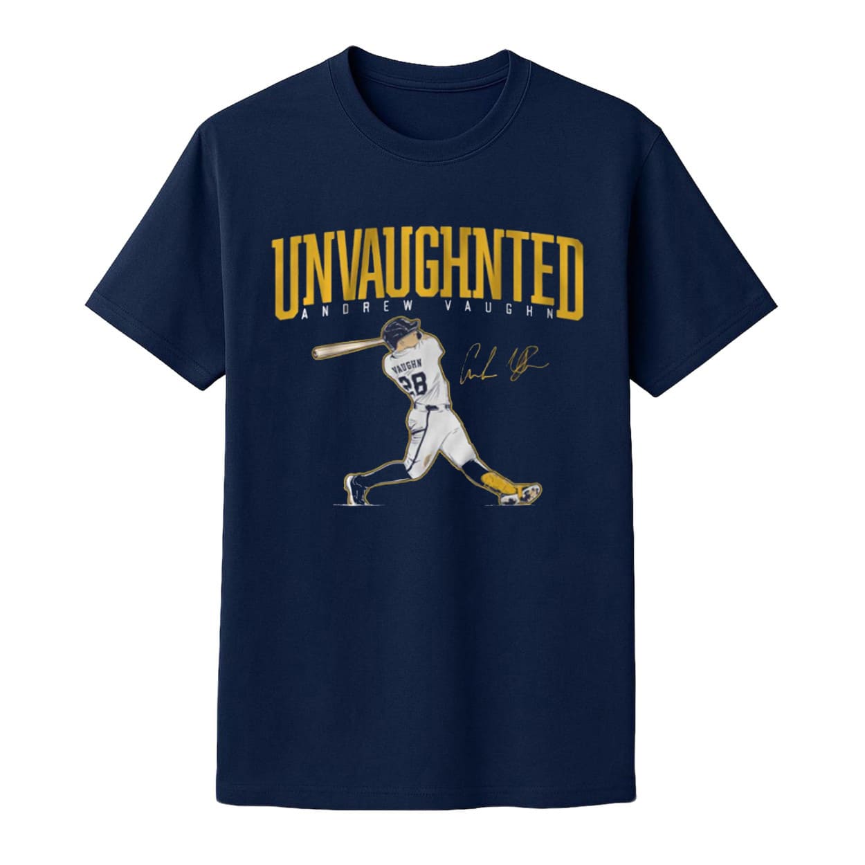 - This sleek navy tee features a striking design with a dynamic illustration of Andrew Vaughn mid-swing, accented by bold “UNVAUGHTED” lettering in yellow.