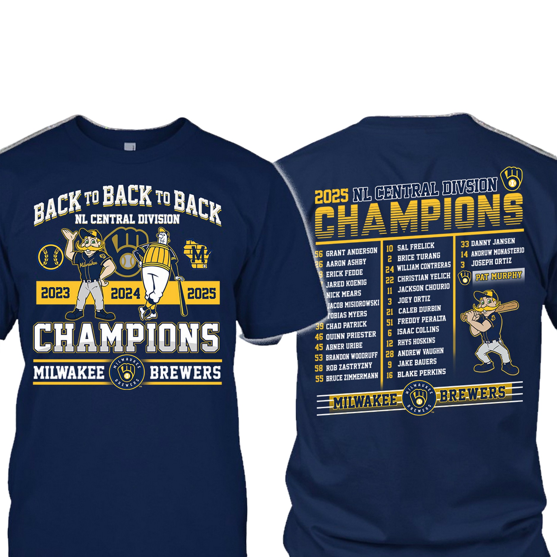 Celebrate an unprecedented milestone with the Brewers Back To Back To Back NL Central Division Champions Shirt. This exclusive tee commemorates the Brewers’ incredible three-peat, solidifying their status as a dominant force in the league. The front of the shirt proudly features two celebratory Brewers mascots, a baseball and a glove, along with the years 2023, 2024, and 2025, a powerful reminder of this historic achievement. The bold “CHAMPIONS” and “MILWAUKEE BREWERS” lettering leaves no doubt about who runs the division.