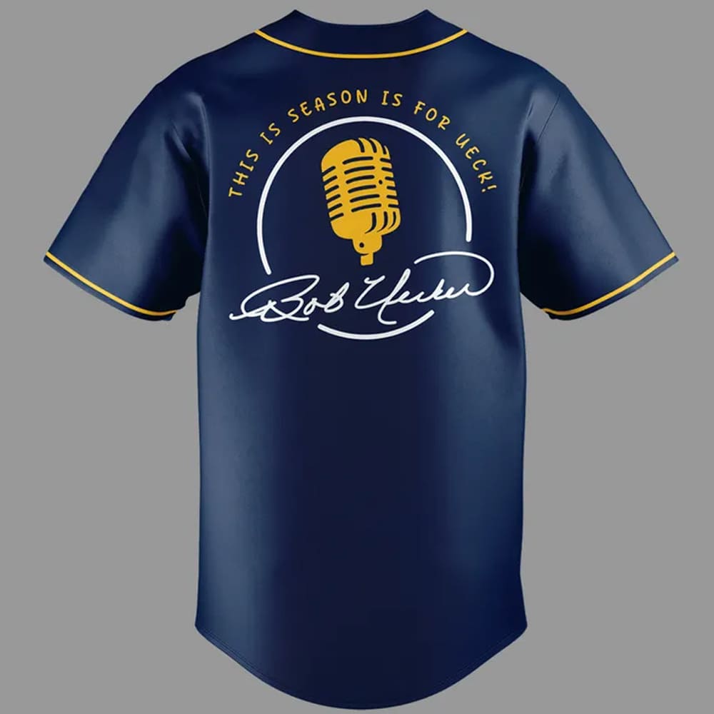 The Back makes this jersey truly unique, featuring a circular graphic with a golden vintage microphone and the heartfelt slogan: “THIS SEASON IS FOR UECK!” encircling it. Below this is the signature of Bob Uecker.