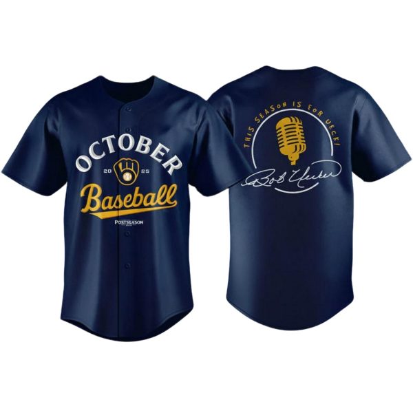 This special “Brewers October Baseball 2025 This Season Is For Ueck Jersey” is a heartfelt tribute to the one and only Bob Uecker, the iconic voice of the Brewers for over five decades. With a bold front design celebrating “October Baseball,” the back of this jersey features a golden microphone, a symbol of the wit and wisdom Uecker shared from the broadcast booth. Below the microphone is his famous signature, immortalizing the man affectionately known as “Mr. Baseball.” This jersey is a must-have for every fan who wants to honor Uecker’s memory and cheer on the team as they chase a title in his honor.