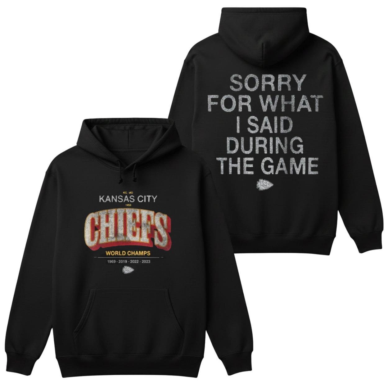 Own your intense game-day emotions and celebrate the Chiefs’ victories with the iconic “Brittany Mahomes Sorry For What I Said During The Game Hoodie.” Inspired by the spirited reactions of Chiefs Kingdom, this hoodie is the perfect way to acknowledge those passionate moments while proudly displaying your team’s championship glory.