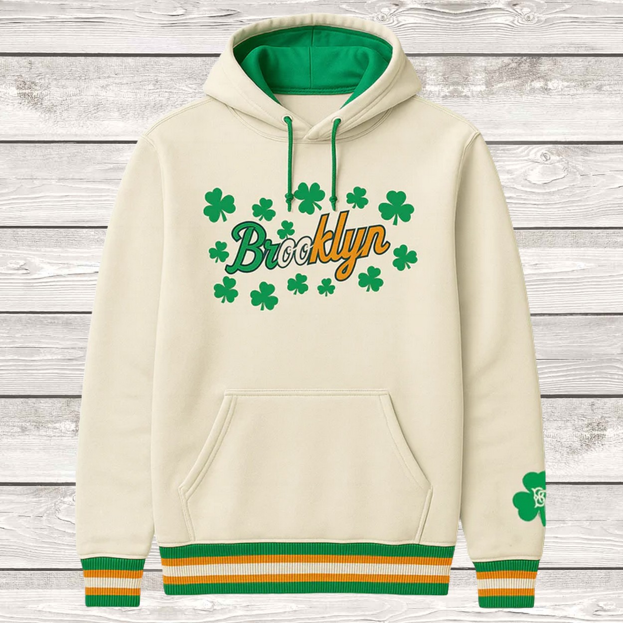 - This cream-colored hoodie features a vibrant design with “Brooklyn” text in green and orange, surrounded by shamrock patterns that symbolize luck and pride.