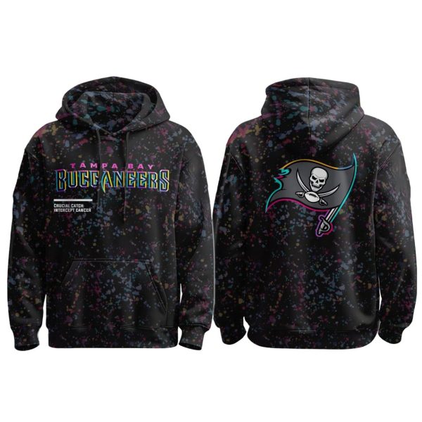 | Design Feature | All-over multi-color splatter print with neon Buccaneers graphics and the “Crucial Catch Intercept Cancer” message. |
