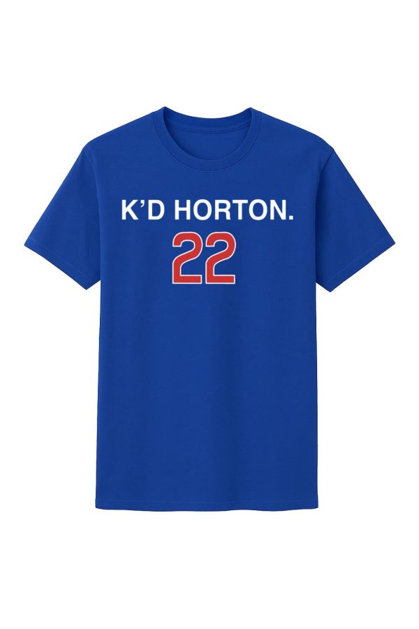 - The shirt proudly displays “K’D HORTON.” in bold white lettering, with his iconic jersey number “22” printed in a striking red outline below.