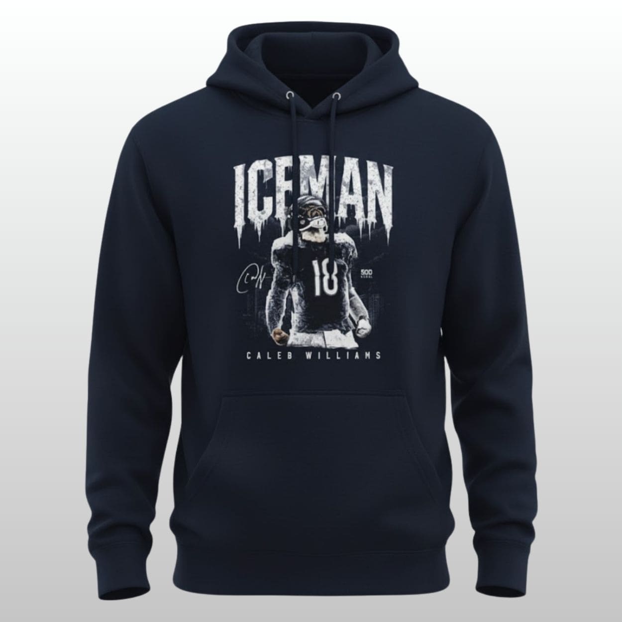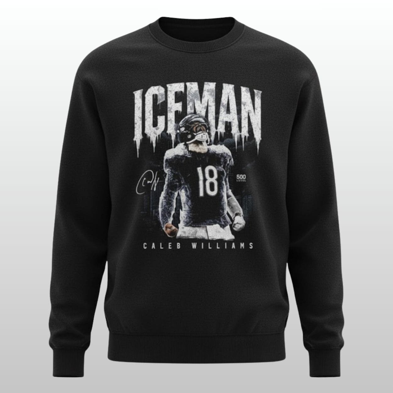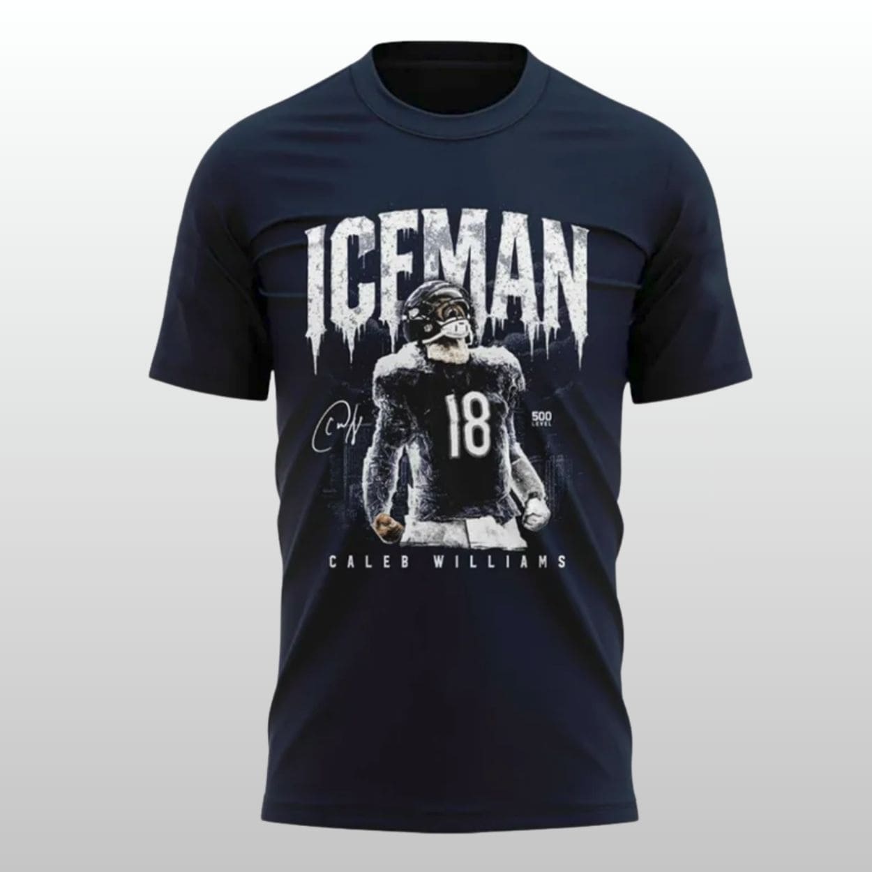 “Iceman” Graphic Artistry: Features a stunning, high-definition “frozen” print of Caleb Williams in action, complete with his signature and number 18.