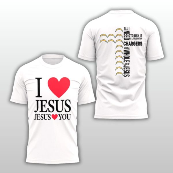 The back showcases a unique vertical cross design formed by the iconic Chargers lightning bolts, accompanied by the text: “ALL I NEED TODAY IS A LITTLE BIT OF CHARGERS AND A WHOLE LOT OF JESUS.”
