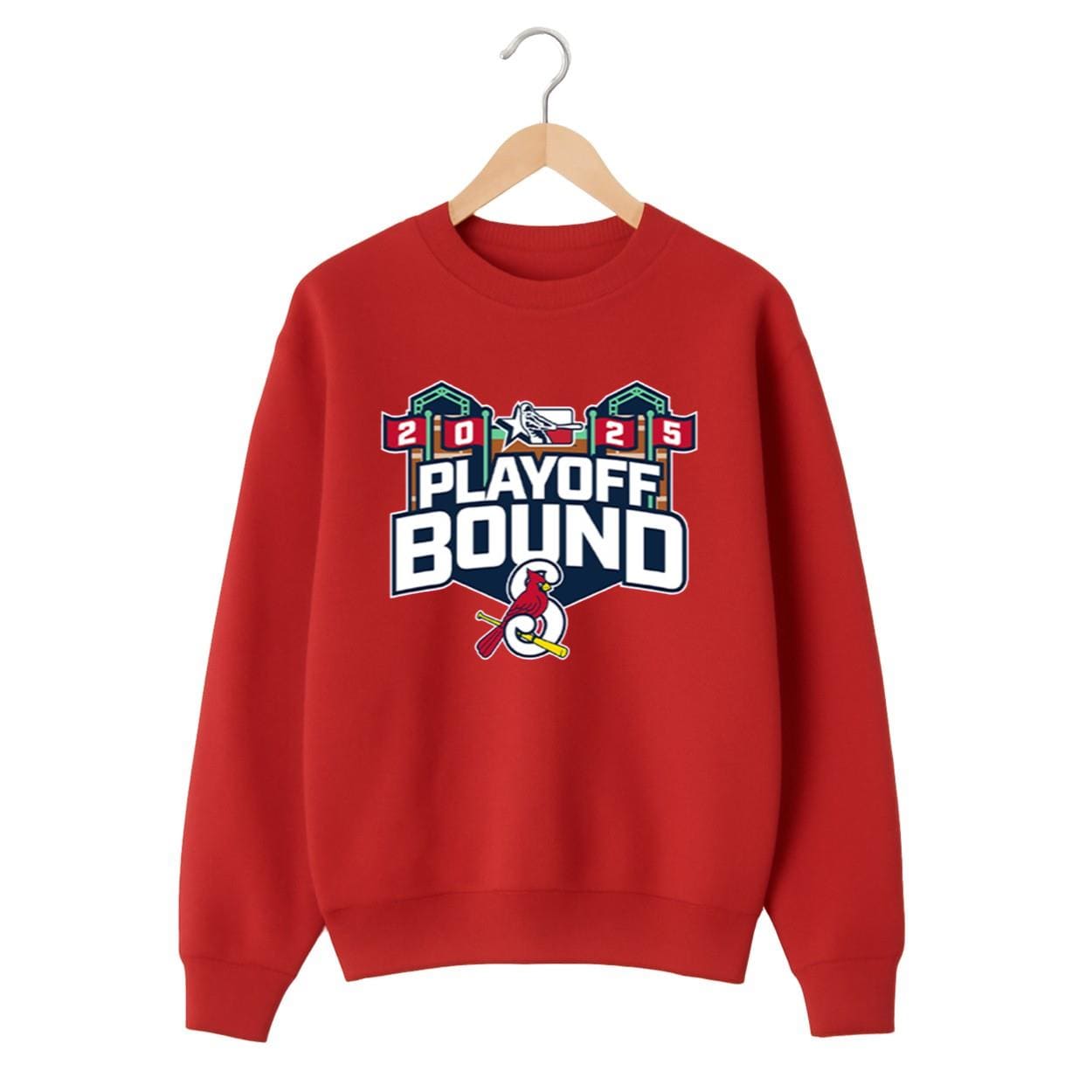 Eye-catching design with “2025 Playoff Bound” lettering, playoff banners, and the classic Cardinals logo.