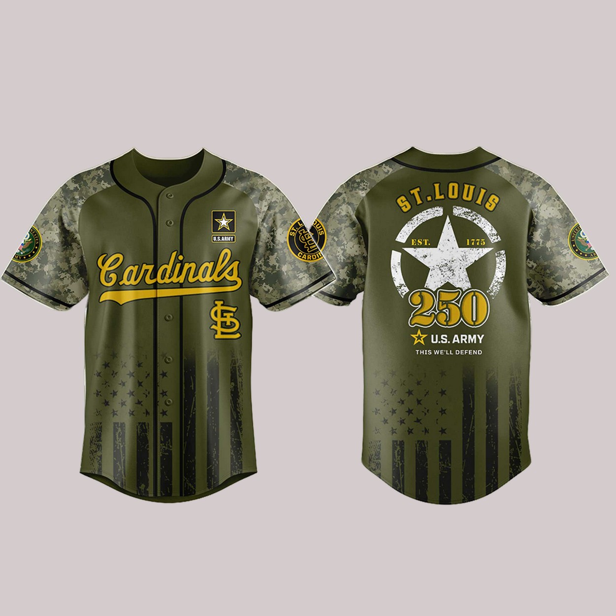 Celebrate 250 yrs of U.S. Army with this Cardinals jersey! Sizes S-6XL, polyester, camo design, and patriotic flair. Perfect for fans. Order now!