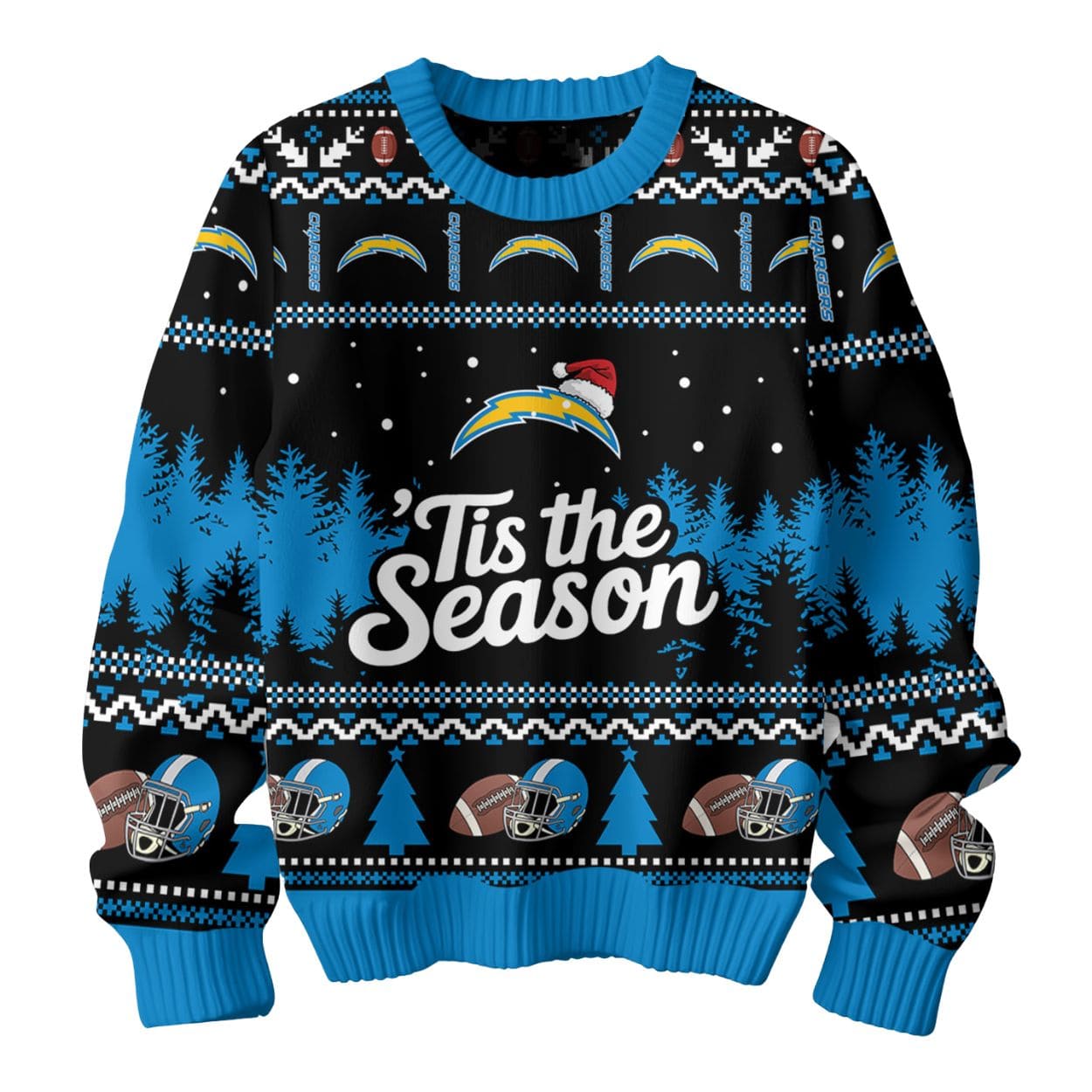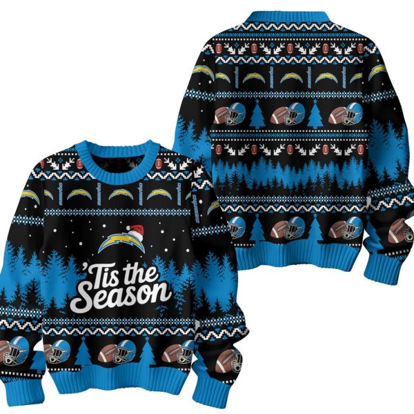 Themed Graphics: The design features repeating Chargers bolt logos, helmets, footballs, and winter pine tree motifs. The central design highlights the Chargers bolt logo wearing a Santa hat above the spirited text: ‘Tis the Season.
