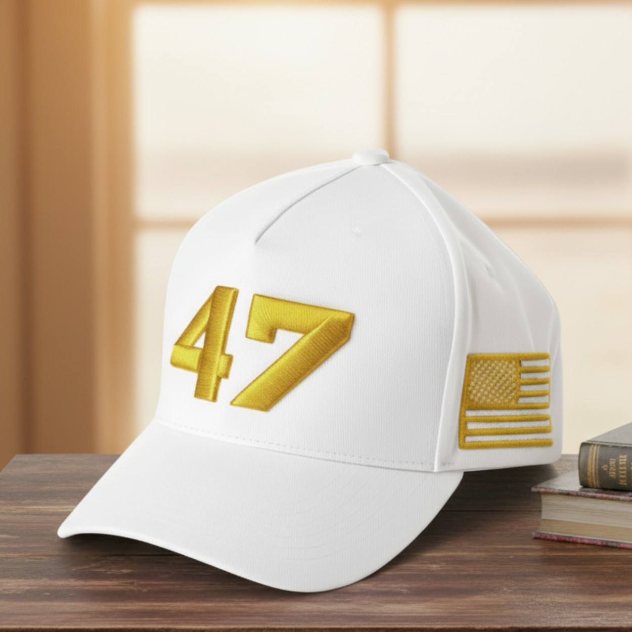 This ap is a bold statement of support, featuring the number “47” and an American flag, both expertly embroidered in a rich gold thread. The vibrant embroidery stands out against the clean white background of the hat, ensuring a sharp and striking appearance. Made from a durable and comfortable cotton x khaki blend, this cap is built for long-lasting wear while providing a lightweight and breathable feel.
