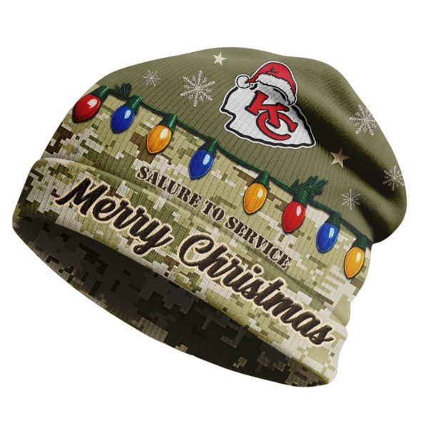 Team Pride: The Chiefs’ iconic “KC” logo is printed near the crown, topped with a cheerful Santa hat to complete the festive look. The text “SALUTE TO SERVICE” is discreetly integrated into the design.