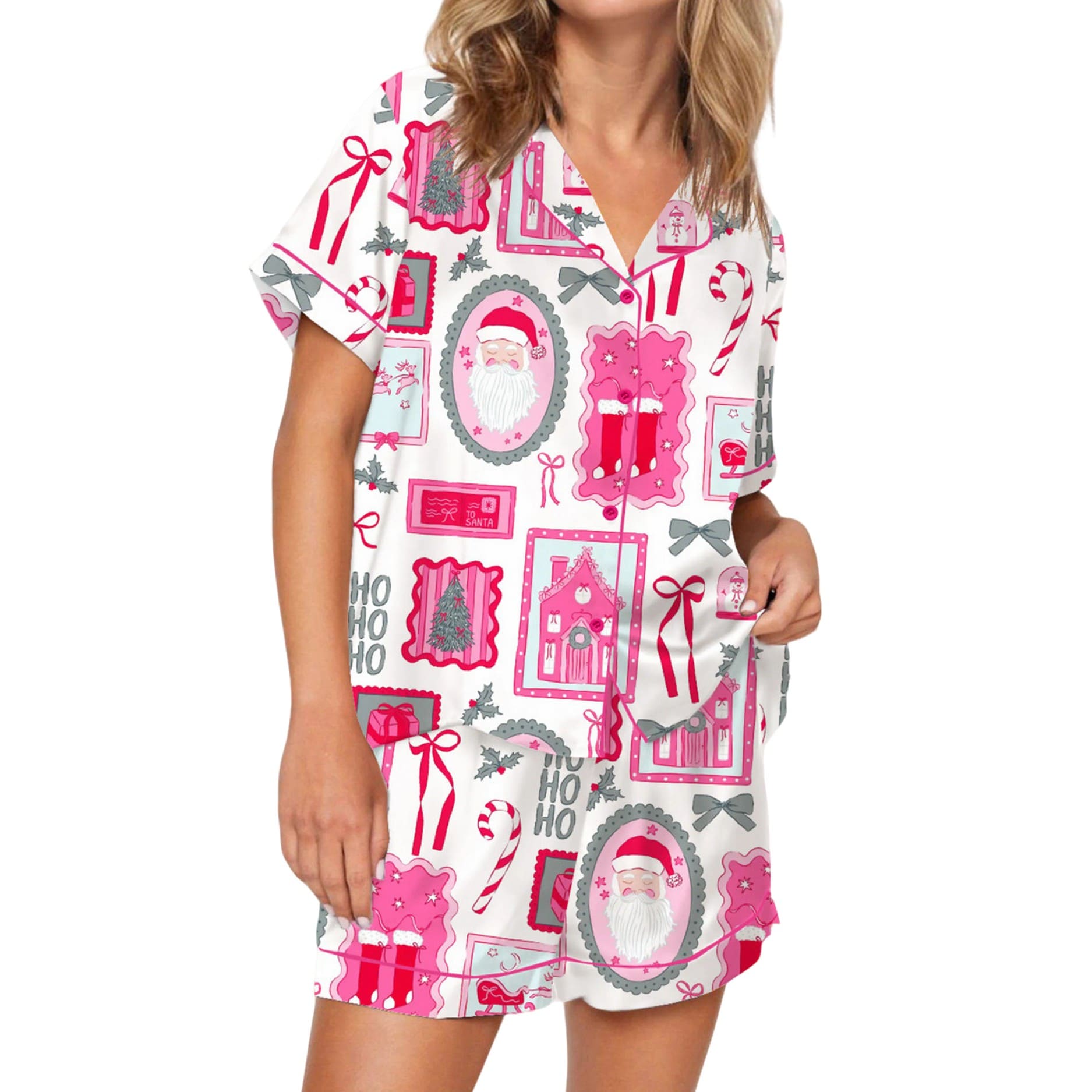 This pajama set stands out with its charming and unique pink-themed Christmas collage print. The silky fabric is adorned with an array of delightful holiday motifs, including: