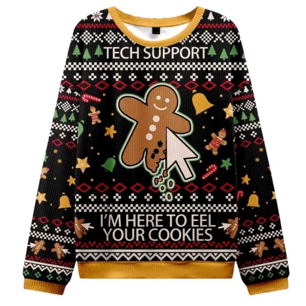 | Design Feature | Full-coverage “ugly sweater” print featuring a Gingerbread Man being clicked by a cursor, and the tech humor slogan: “TECH SUPPORT I’M HERE TO EEL YOUR COOKIES.” |