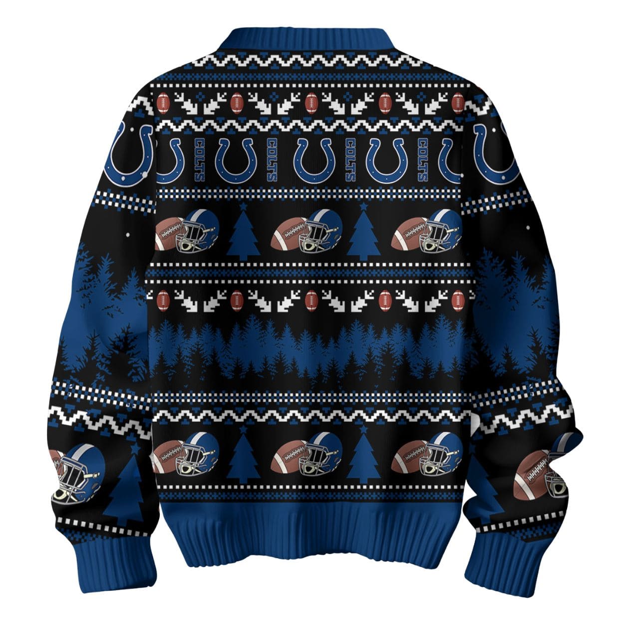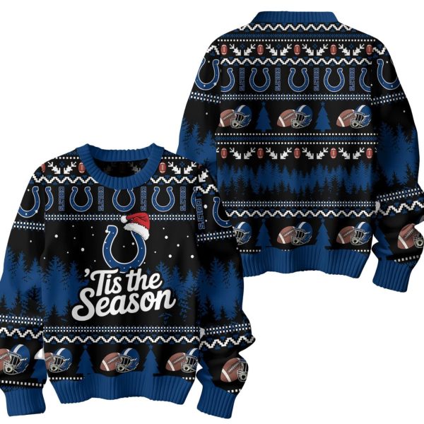 The sweater features a classic Colts blue and black base, adorned with a traditional “ugly sweater” pattern of snowflakes, geometric designs, and dark pine trees. Front and center is the iconic Colts horseshoe logo topped with a cheerful Santa hat, sitting above the spirited phrase ‘Tis the Season. The design extends across the sweater with repeating rows of the horseshoe logo (some labeled “COLTS”), football helmets, and footballs on the shoulders, chest, and back.