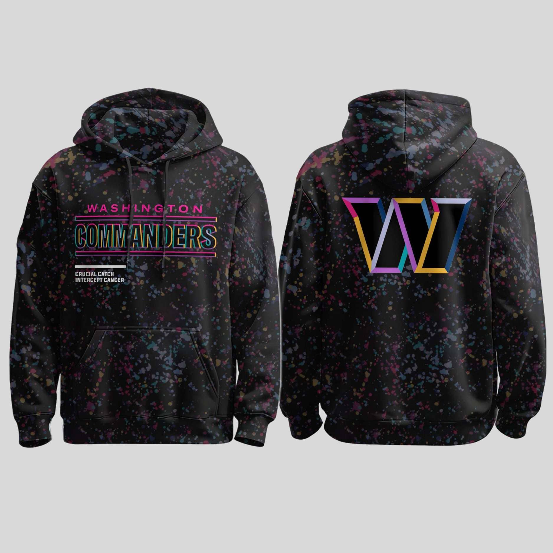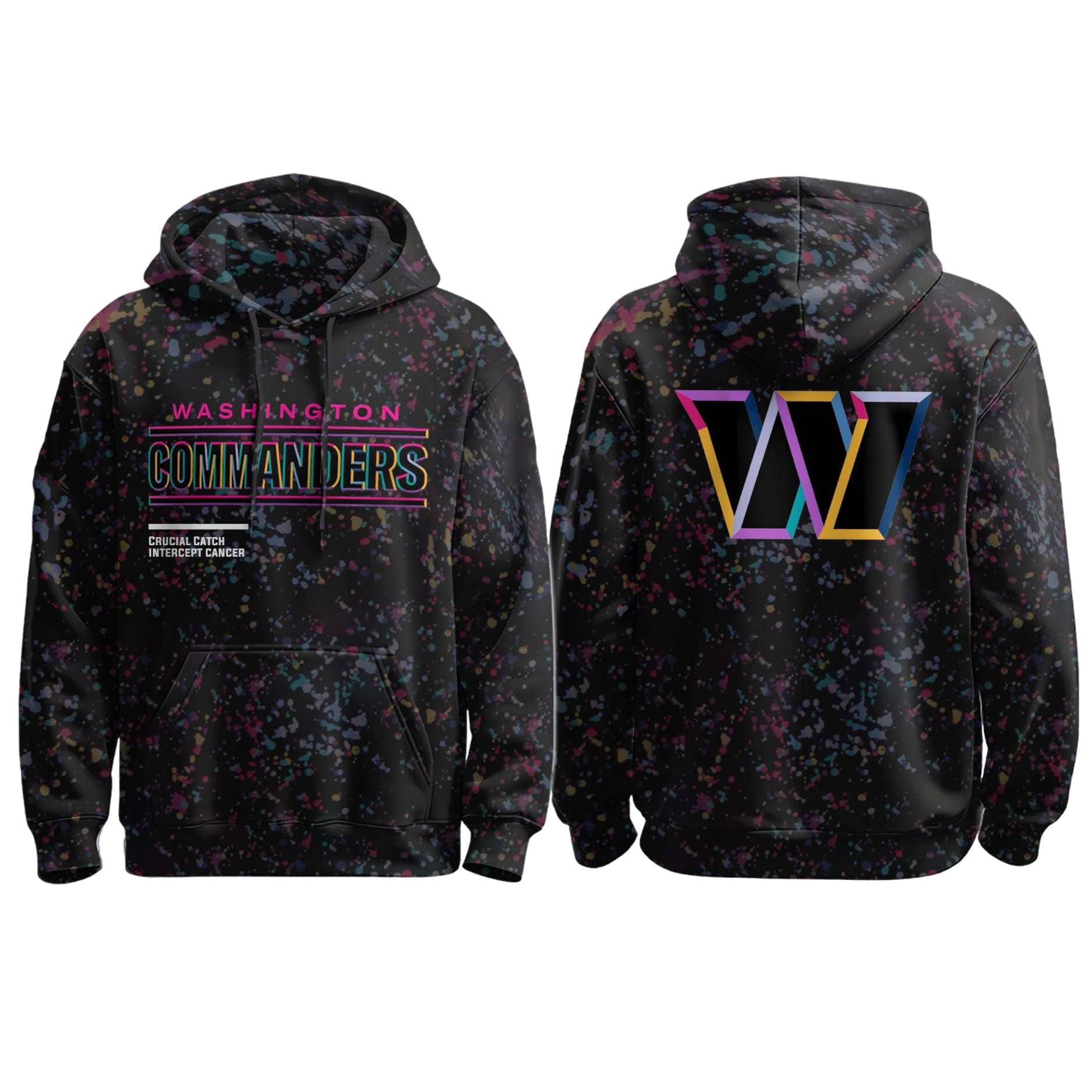 | Design Feature | All-over multi-color splatter print with neon Commanders graphics and the “Crucial Catch Intercept Cancer” message. |
