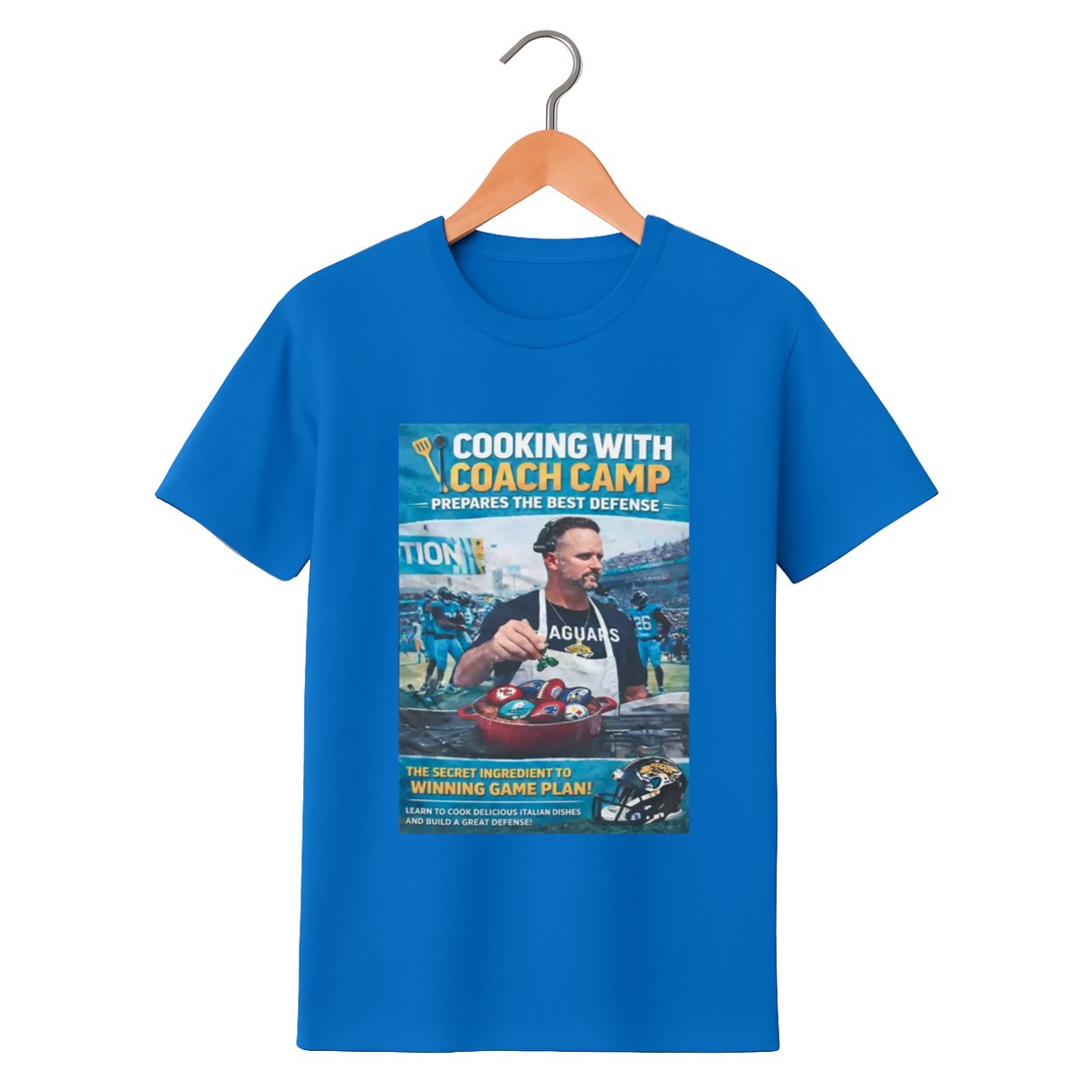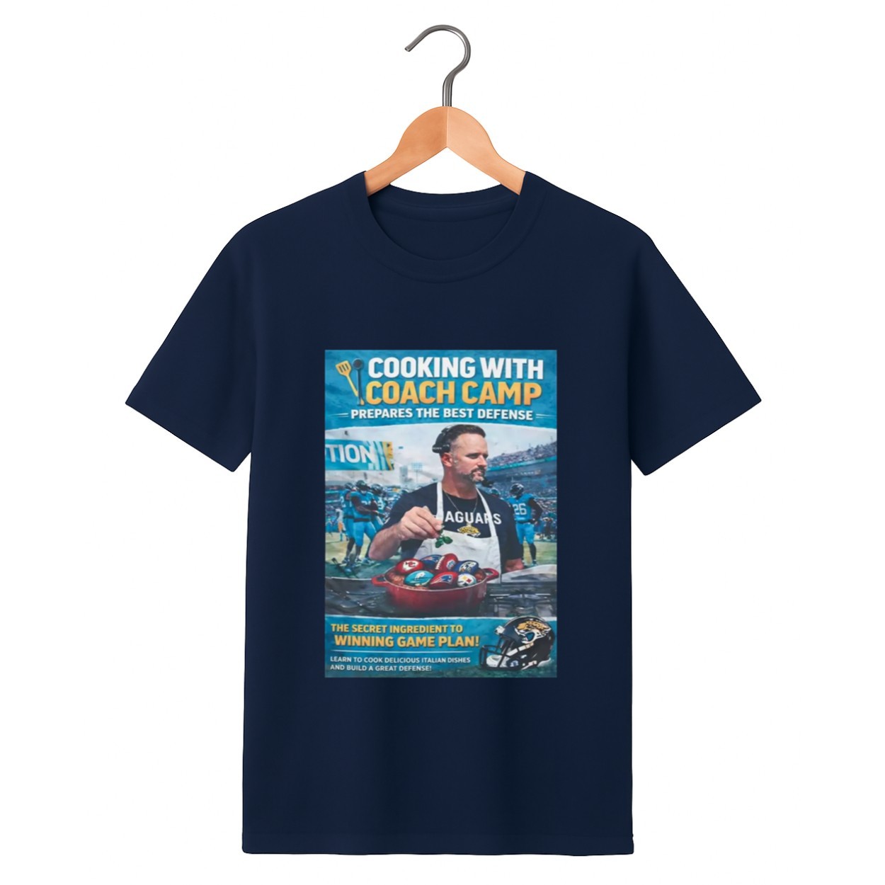 Cook up a winning strategy for your game-day wardrobe with the Cooking With Coach Camp Shirt. This unique graphic tee blends football fever with culinary humor, featuring a detailed illustration of a coach preparing “the best defense”. Whether you are a die-hard Jaguars fan or just love a creative sports parody, this shirt is the secret ingredient your collection has been missing.