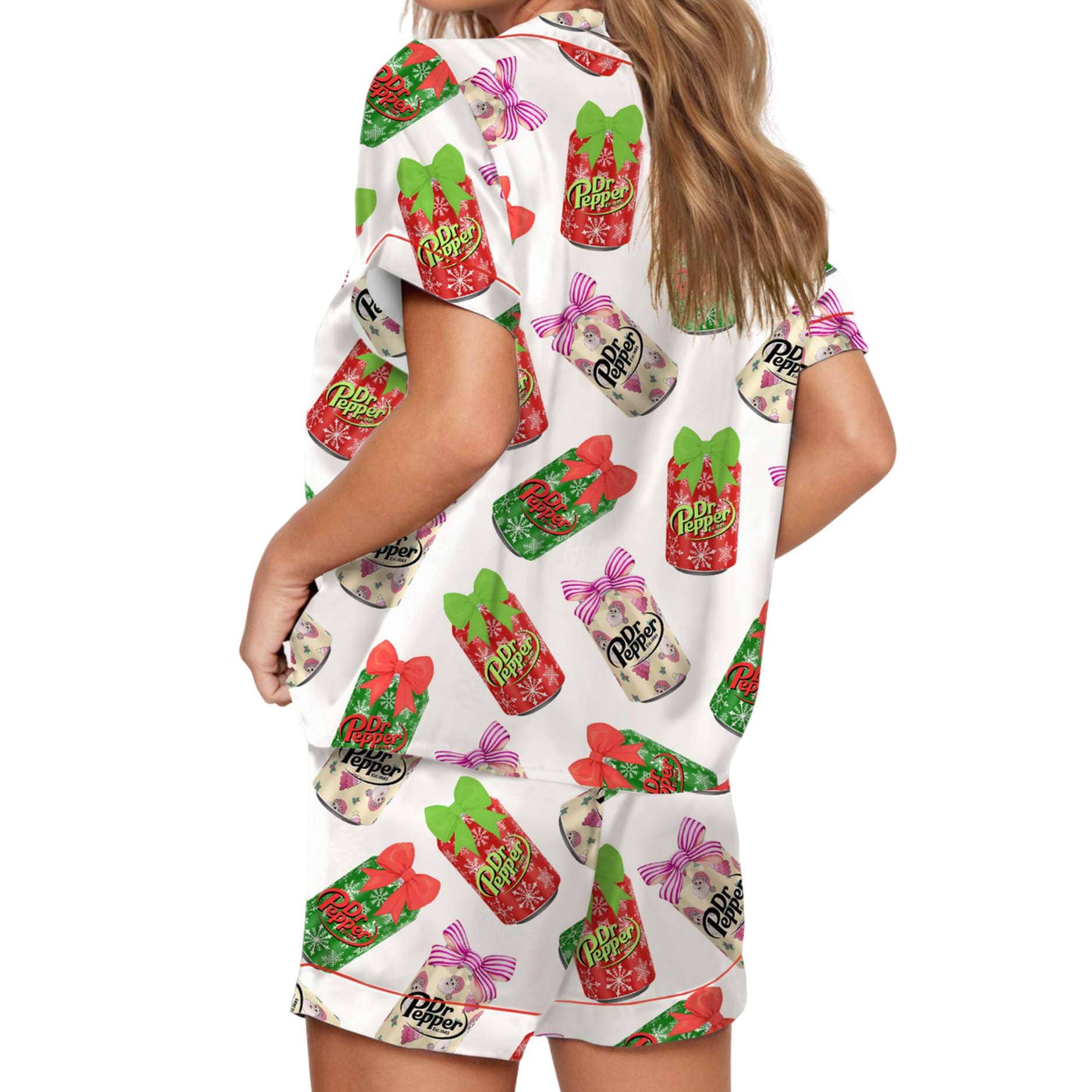 This exquisite two-piece set features a whimsical, all-over pattern on a crisp white satin-like background. The main focus is a vibrant repeating motif of Dr Pepper soda cans wrapped like Christmas presents, each one adorned with playful holiday flair:
