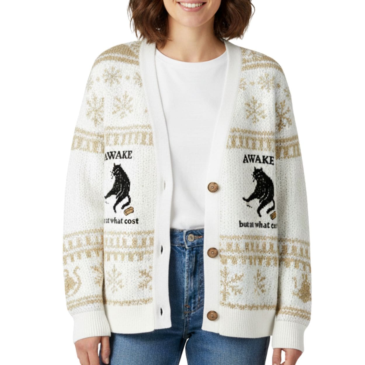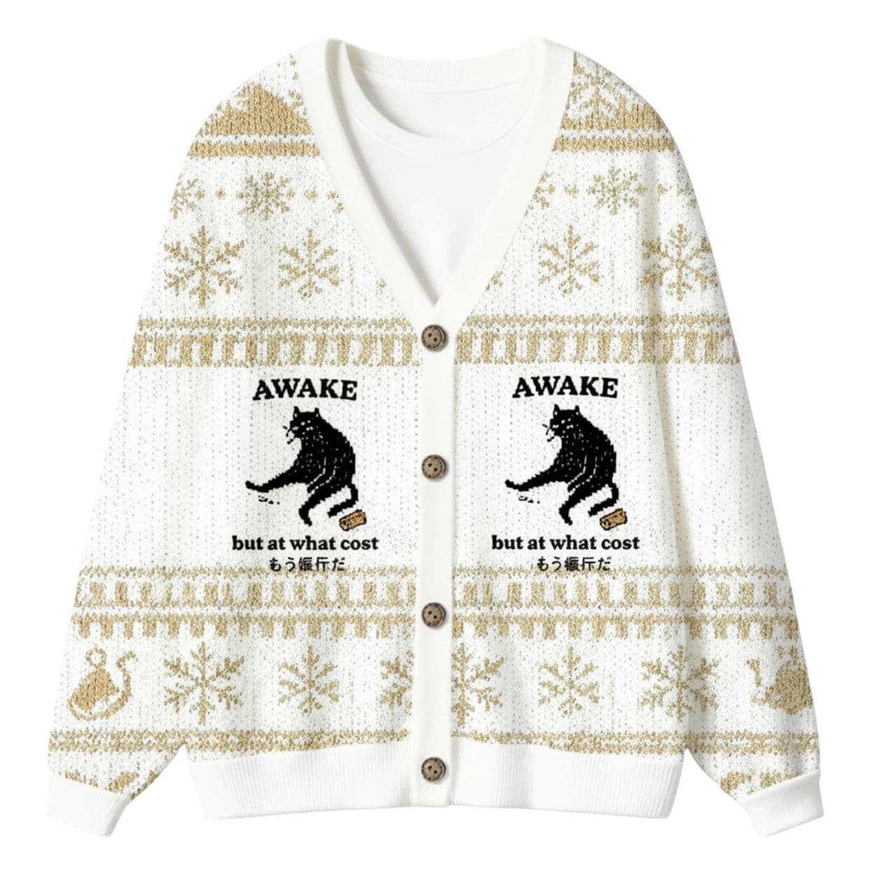 Are you awake, but barely functioning? The “Decadent Smoking Cat Ugly Cardigan Sweater” perfectly captures that end-of-year, sleep-deprived mood!