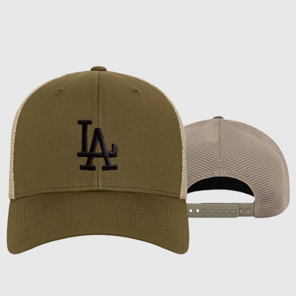 - Its embroidered “LA” logo stands out against the olive-green front, while the tan mesh back provides ventilation.
