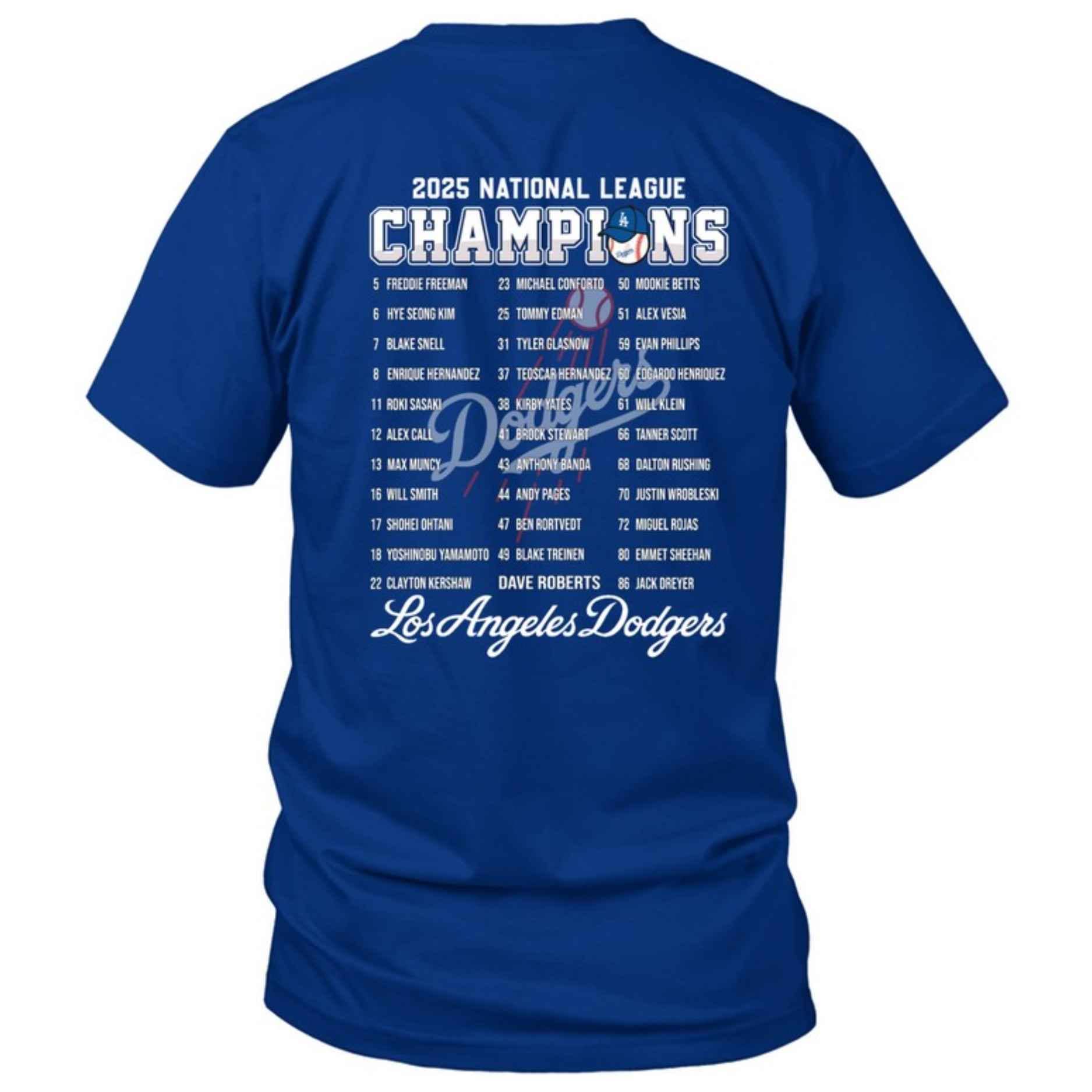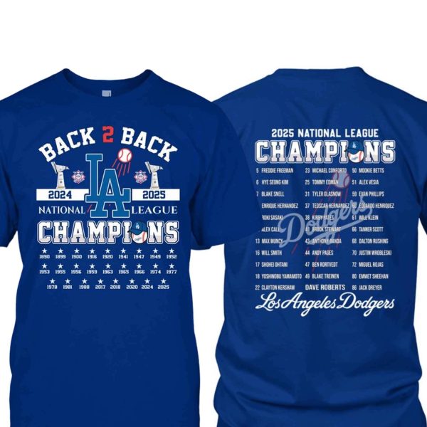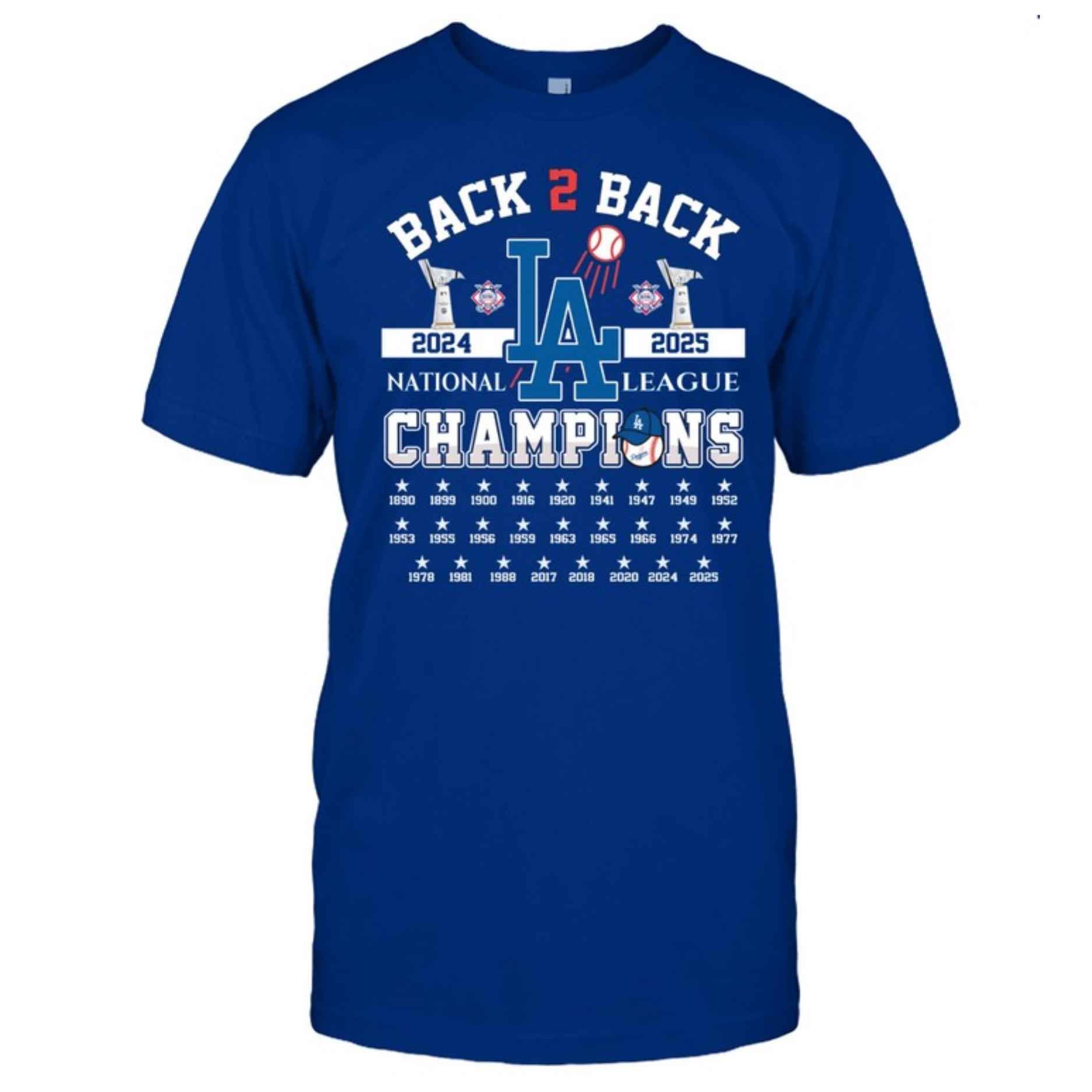 Witness and celebrate history in the making with the Dodgers Back 2 Back NL Champions 2024-2025 Shirt!