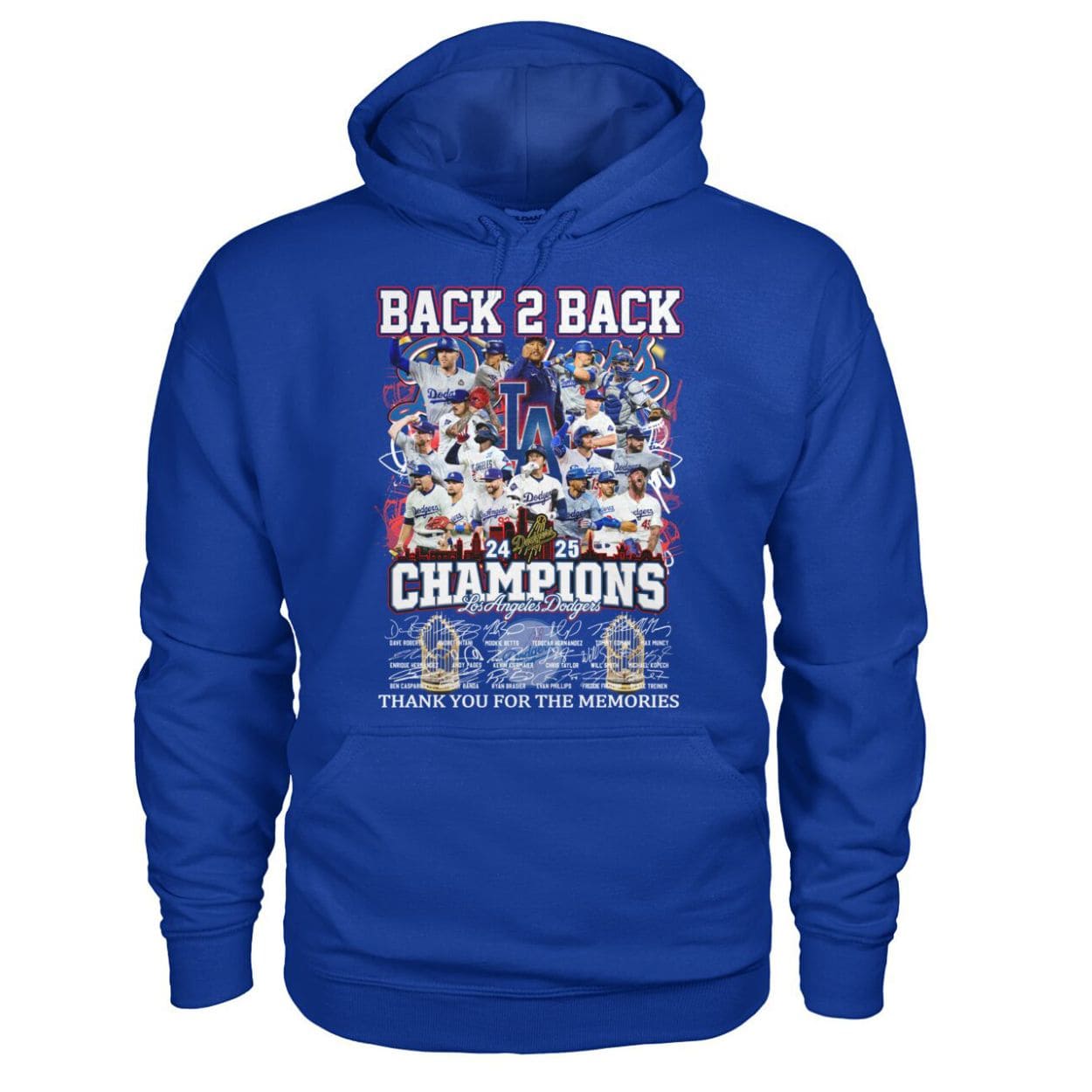 | Design Feature | Double-sided print: “Back 2 Back World Series Champions 2024-2025” crest with player photo collage and full Roster Signatures. |