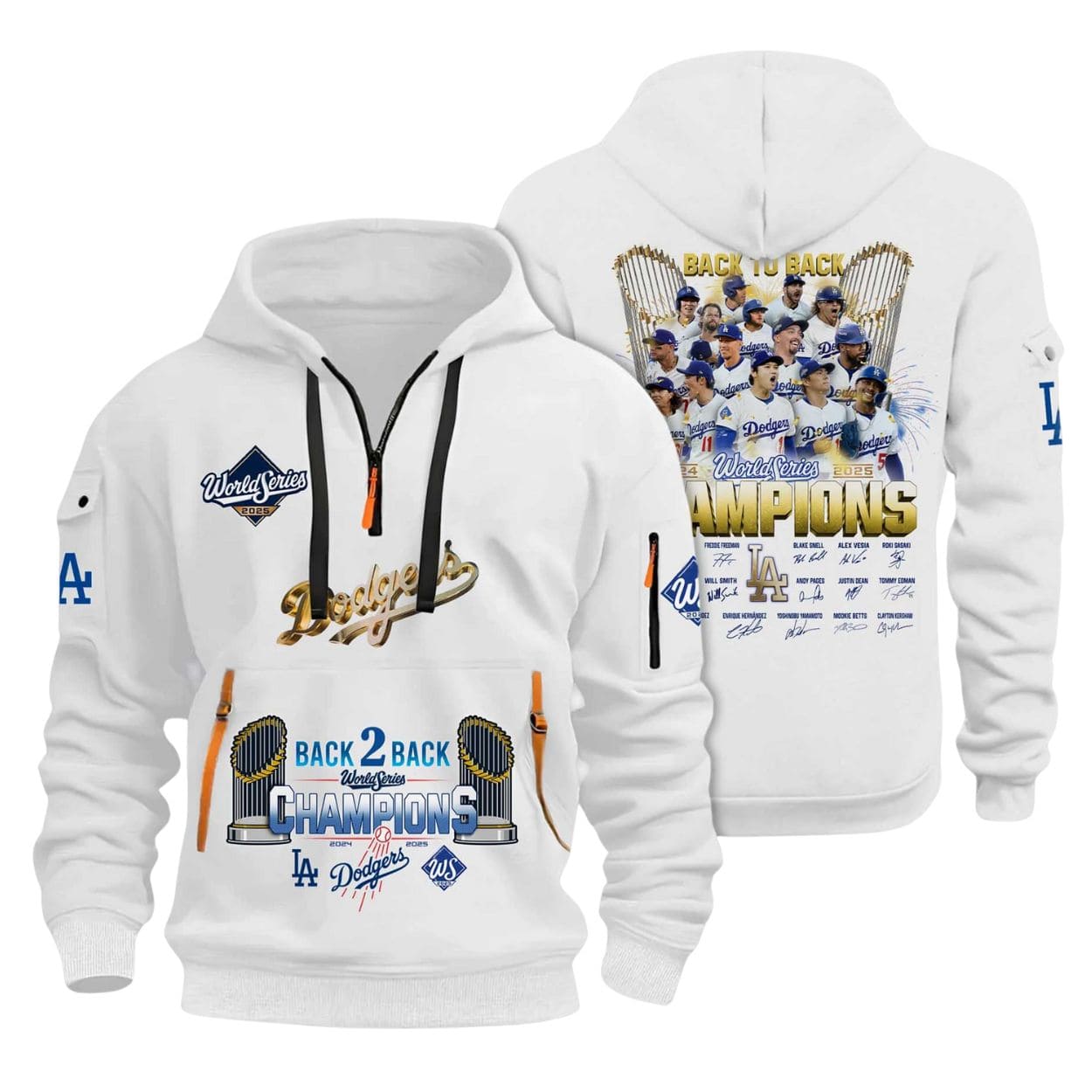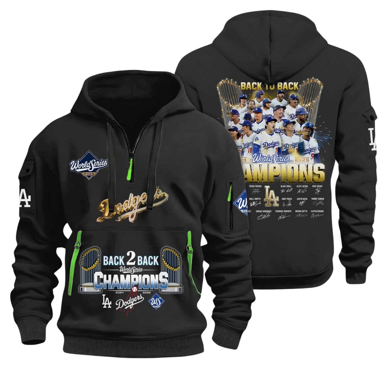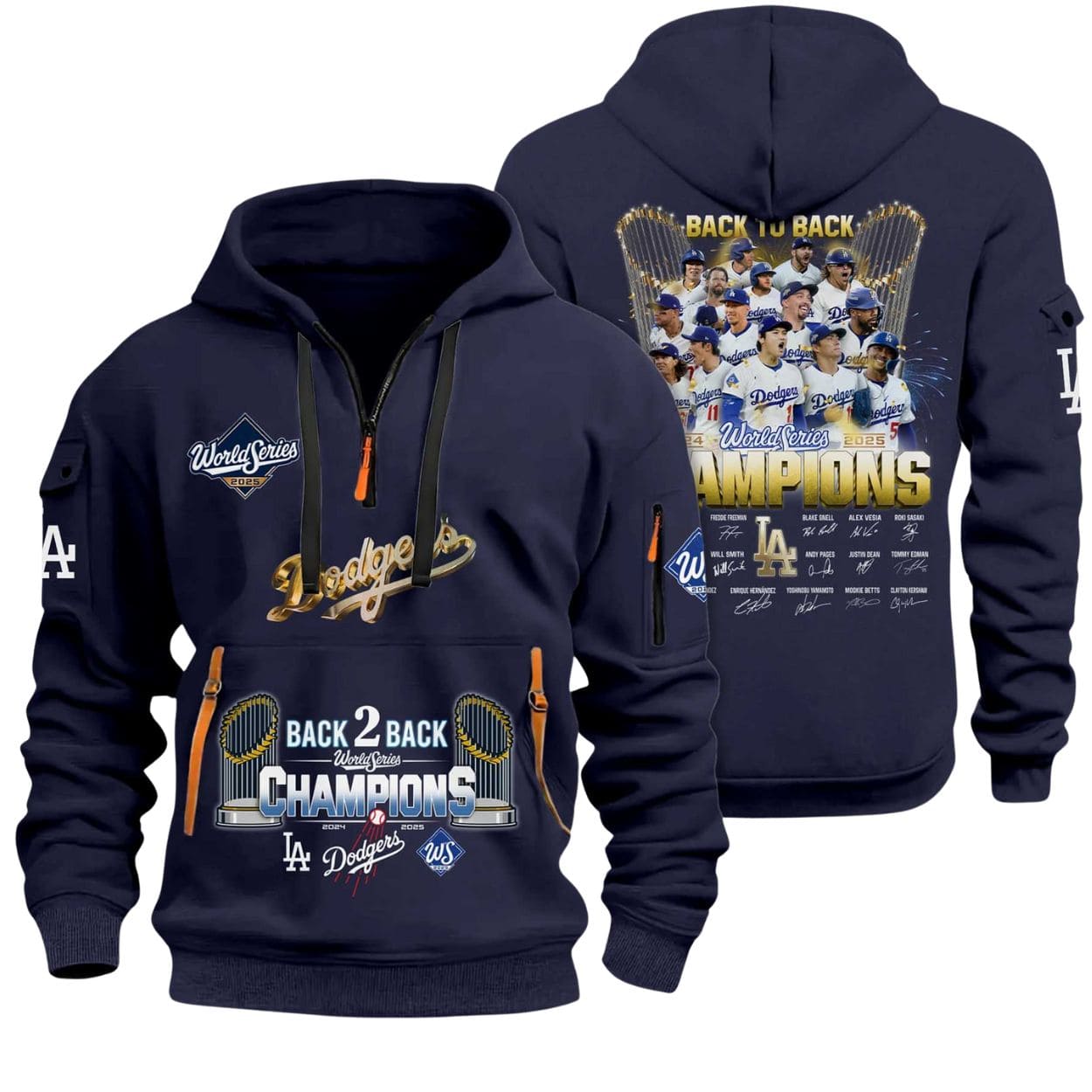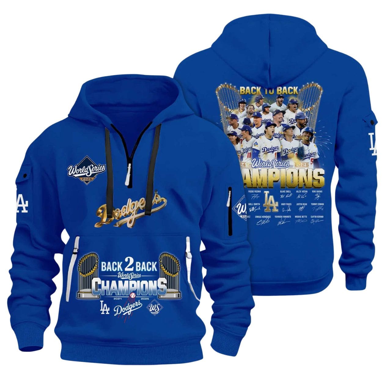 | Design Feature | Quarter-zip utility style in Dodger Blue, featuring the Back 2 Back World Series Crest and a player celebration photo with signatures on the back. |
