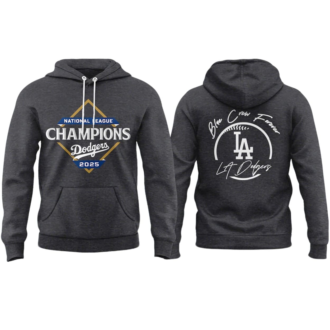 | Design Feature | Double-sided print: Gold-framed NL Champions crest (Front) and “Blue Crew Forever” graphic with baseball stitch detail (Back). |