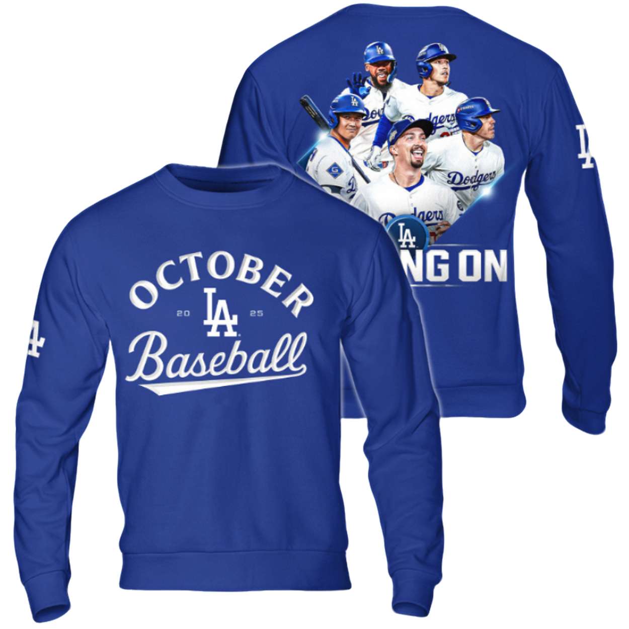 - Front: Features the classic script “October Baseball” with the “LA” logo and the year “2025” proudly nestled below, declaring the team’s postseason status for the year.