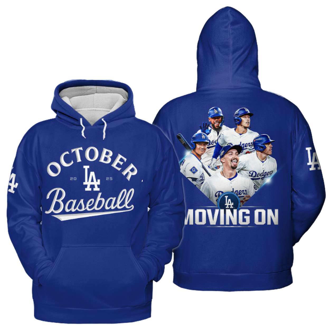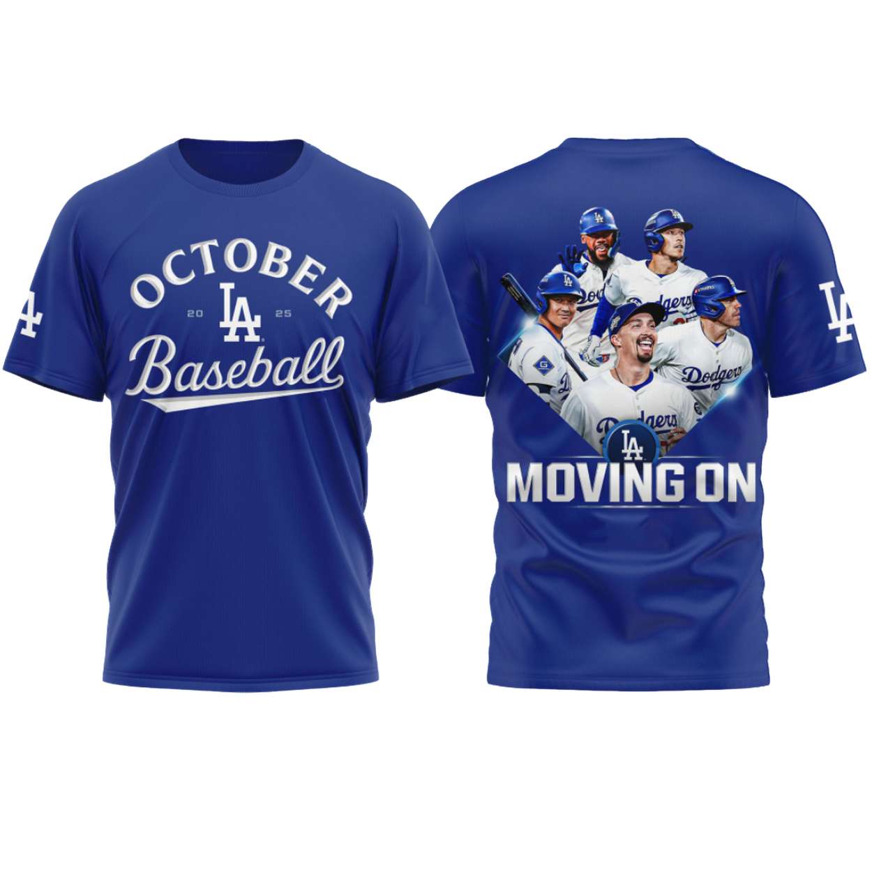 - Back: A dynamic, full-color graphic features a collage of star Dodgers players celebrating and focused on the game. Prominently placed below the players is the phrase “MOVING ON” with the LA logo.