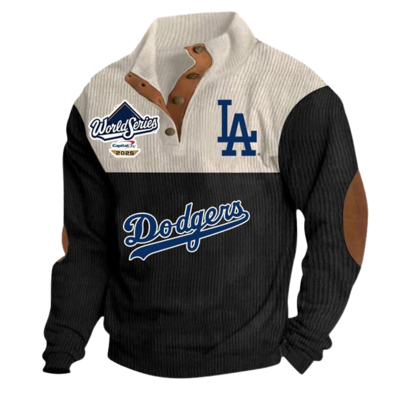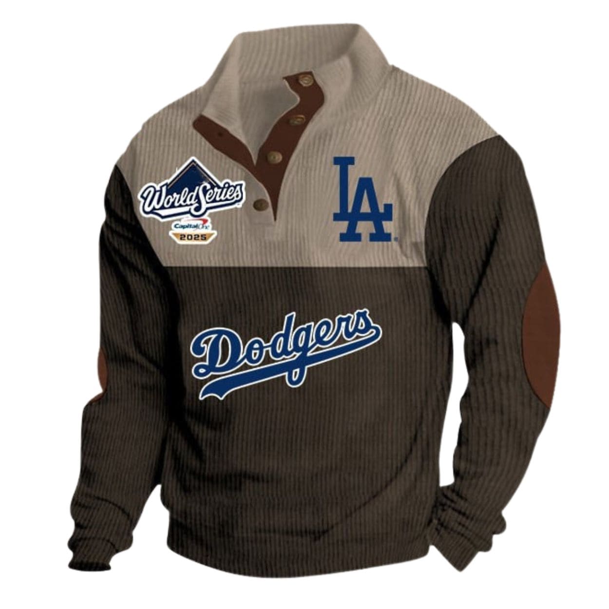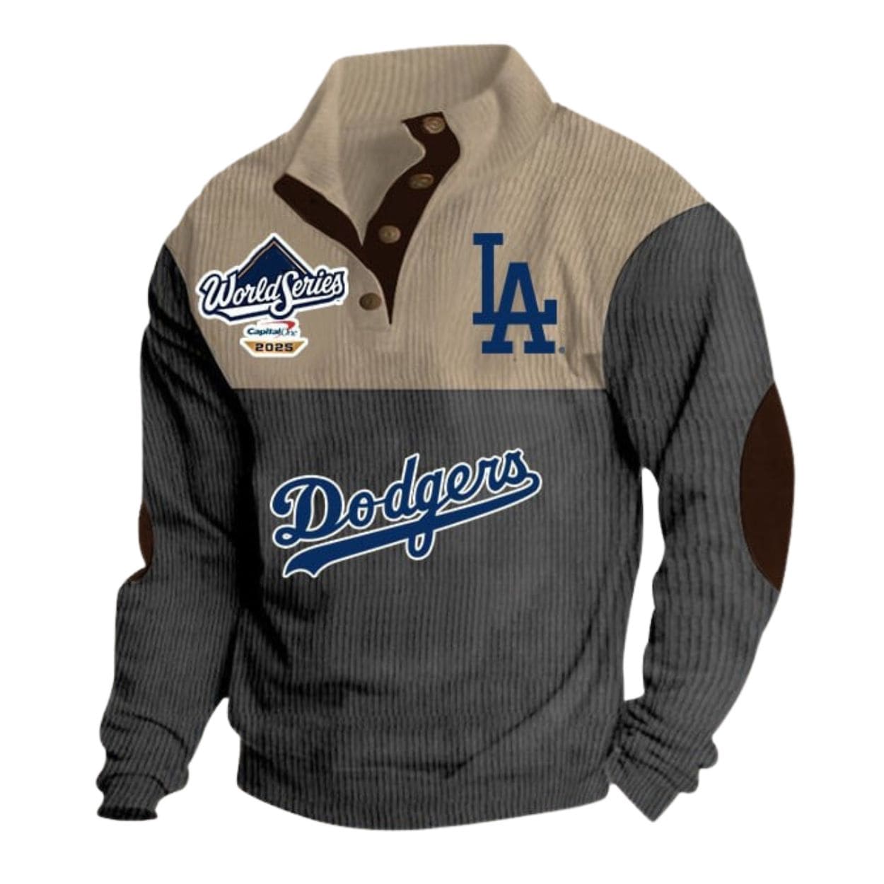 | Design Feature | Stand-up collar with f-a-u-x leather placket, World Series 2025 crest, and split Khaki/Blue ribbed print with “LA” and “Dodgers” logos. |