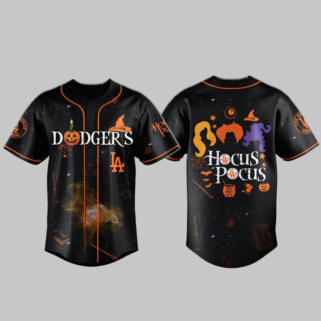Crafted from breathable polyester, this jersey showcases a deep black fabric that serves as a canvas for its enchanting details. The front features the iconic “DODGERS” wordmark, creatively styled with a spooky pumpkin. Below, the classic “LA” logo is surrounded by an eerie, swirling vortex, reminiscent of the Sanderson sisters’ powerful spells. A witch’s hat rests atop the wordmark, while subtle Halloween motifs like bats, potions, and spellbooks float across the fabric. The back of the jersey is a true masterpiece, featuring the iconic hair silhouettes of the three Sanderson sisters—Winifred, Mary, and Sarah—above the “Hocus Pocus” title. A Dodgers baseball with a special “HOCUS POCUS” logo is printed below, uniting the two themes seamlessly.