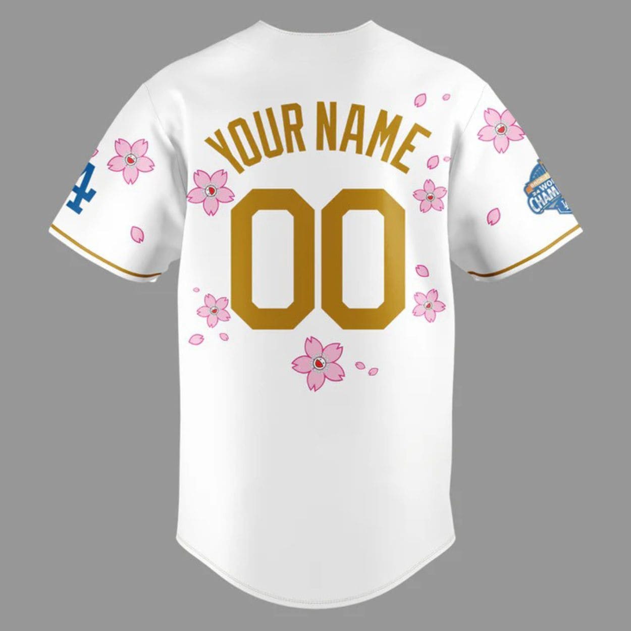 The back of the jersey is fully customizable with “YOUR NAME” and “00” in bold, championship-gold-hued numbers and letters, all floating within a scatter of delicate pink sakura. The overall aesthetic is a celebratory fusion of Japanese Pop art and American baseball tradition.