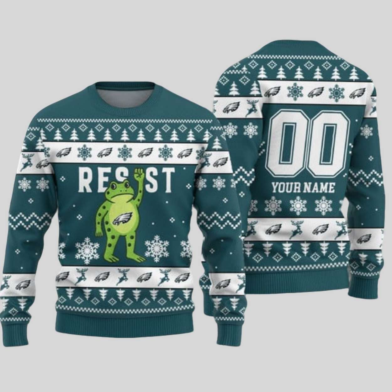 Charge into the holiday season with the legendary Philly spirit, a touch of protest humor, and a personalized touch! The Eagles Portland Frog Resist Ugly Christmas Sweater is the ultimate statement gear, blending quirky internet culture with fierce Philadelphia pride.
