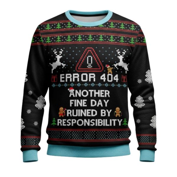 The sweater features a stylish black background adorned with festive “ugly knit” patterns in red, green, and white—including reindeer, Christmas trees, and snowflakes. The centerpiece is a prominent warning sign graphic, typical of a web error, which introduces the core message: “ERROR 404” above the text, “ANOTHER FINE DAY RUINED BY RESPONSIBILITY.” Gingerbread men and holiday stars accent the text, adding a whimsical touch to the deeply relatable complaint.