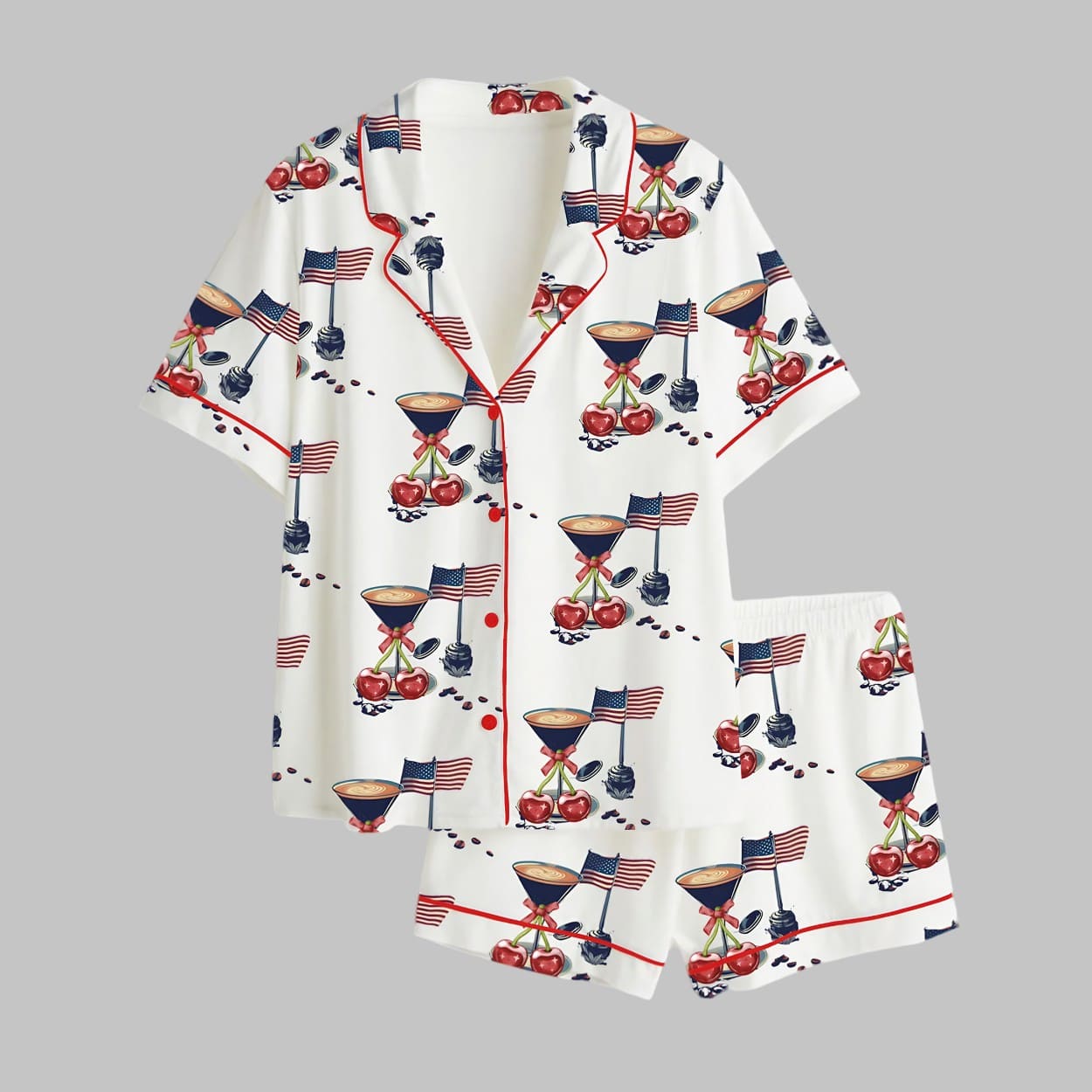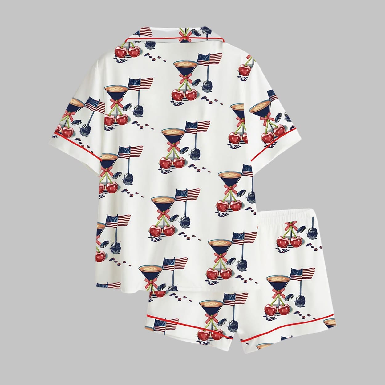 Espresso Martini Cherry Coquette Bow USA Flag Cocktail 4th Of July Satin Pajama Set Overview