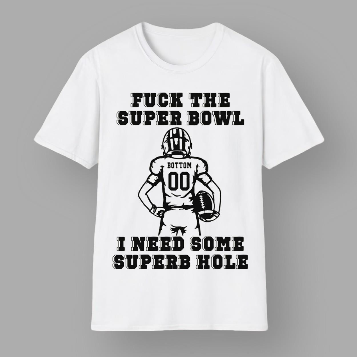 This shirt features a bold graphic of a football player from the back, with the jersey reading “BOTTOM 00.” The phrase “F*ck The Super Bowl I Need Some Superb Hole” is printed in strong, blocky typography, making a bold and hilarious statement. The design blends sports and humor in a cheeky way, making it the perfect icebreaker for any gathering.