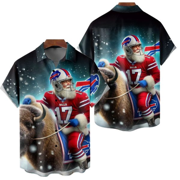 The Icon: The central, all-over graphic depicts Santa Claus wearing a Bills uniform (with #17), a Bills helmet, and a long white beard, riding a fierce, charging buffalo through the snow.