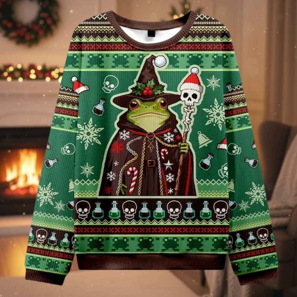| Design Feature | Full-coverage “ugly sweater” print featuring a Frog Wizard with a skull staff, potion bottles, and gothic holiday patterns. |